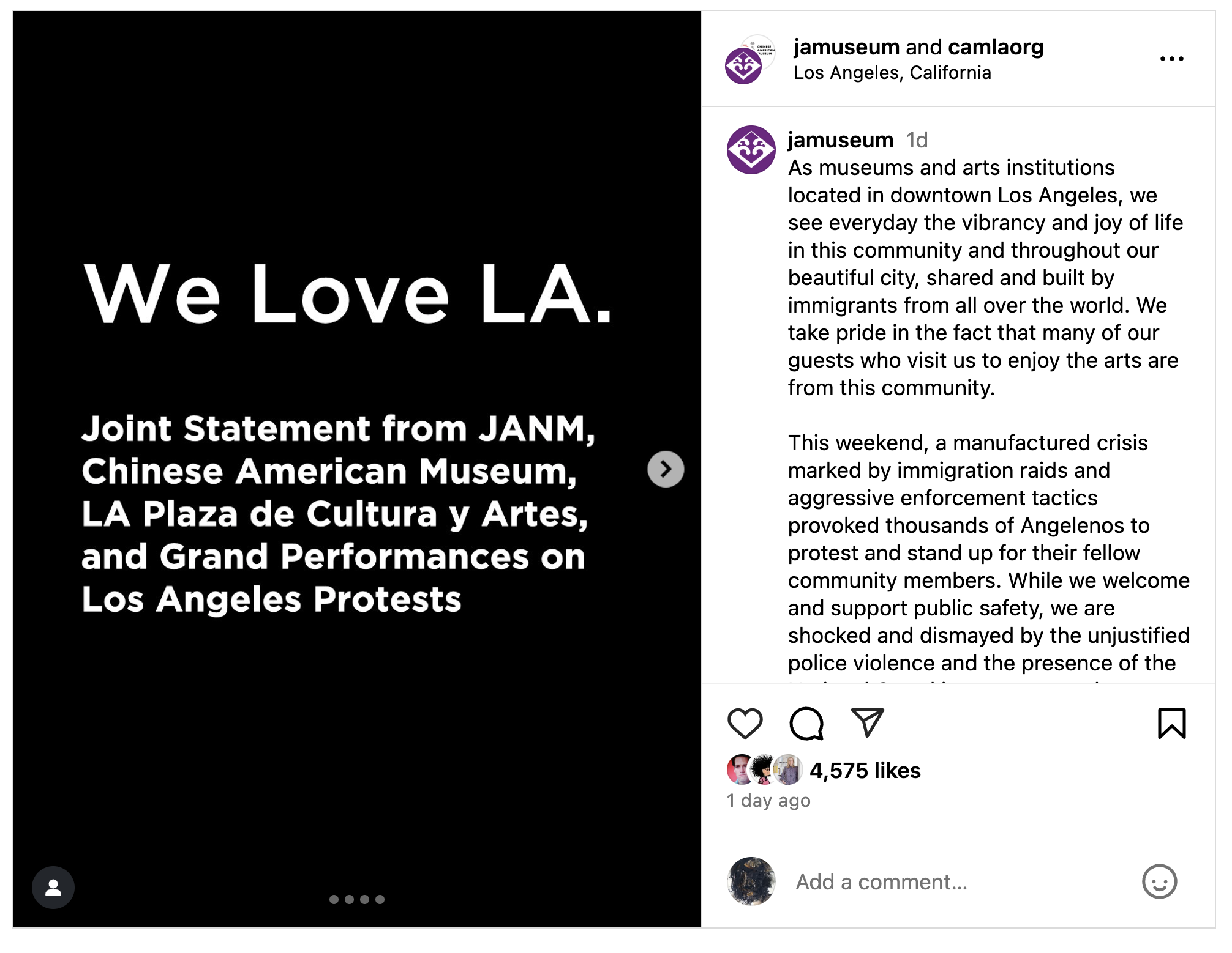 LOS ANGELES — In response to the ICE raids and subsequent protests that began last week in Los Angeles, several arts organizations have made statements in solidarity with immigrants and activists. On Monday, four art spaces located in downtown LA — the Japanese American National Museum, Chinese American Museum, LA Plaza de Cultura y Artes, and Grand Performances — issued a joint statement calling the events of last weekend a “manufactured crisis.”