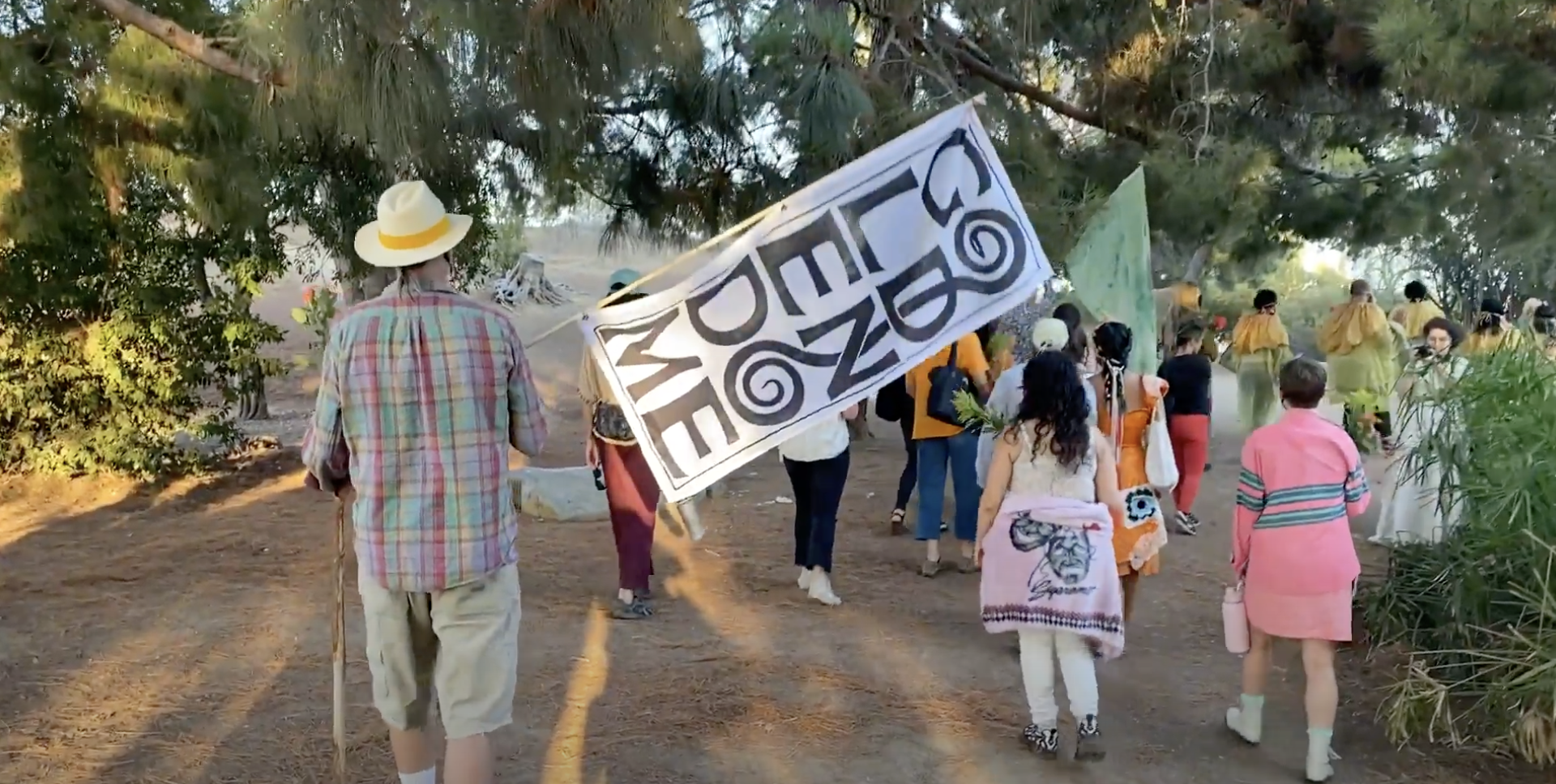 I first encountered Frías’s work at the lake at Ernest E. Debs Regional Park in LA’s Highland Park neighborhood, where they joined the Golden Dome School, a community dedicated to mysticism and the arts, in a social practice performance called “The Resurrection of Care.” The participants circled the lake, which sits atop a hill with a panoramic view of the city, and played music and chants. At one point, haunting wailing broke through the silence, expressing the grief of living through the harrowing events of the pandemic and the wildfires in California in the summer of 2022. The performance offered a sense of healing and release during this catastrophic time.