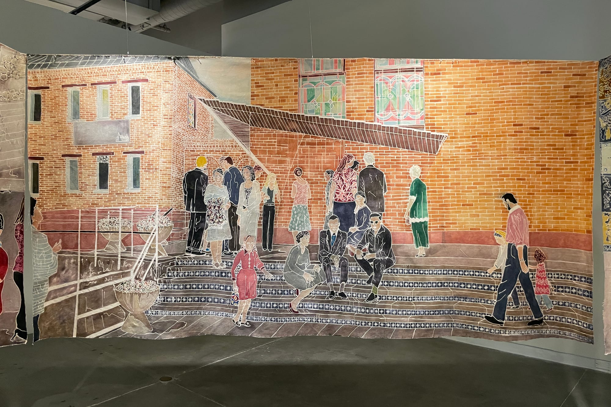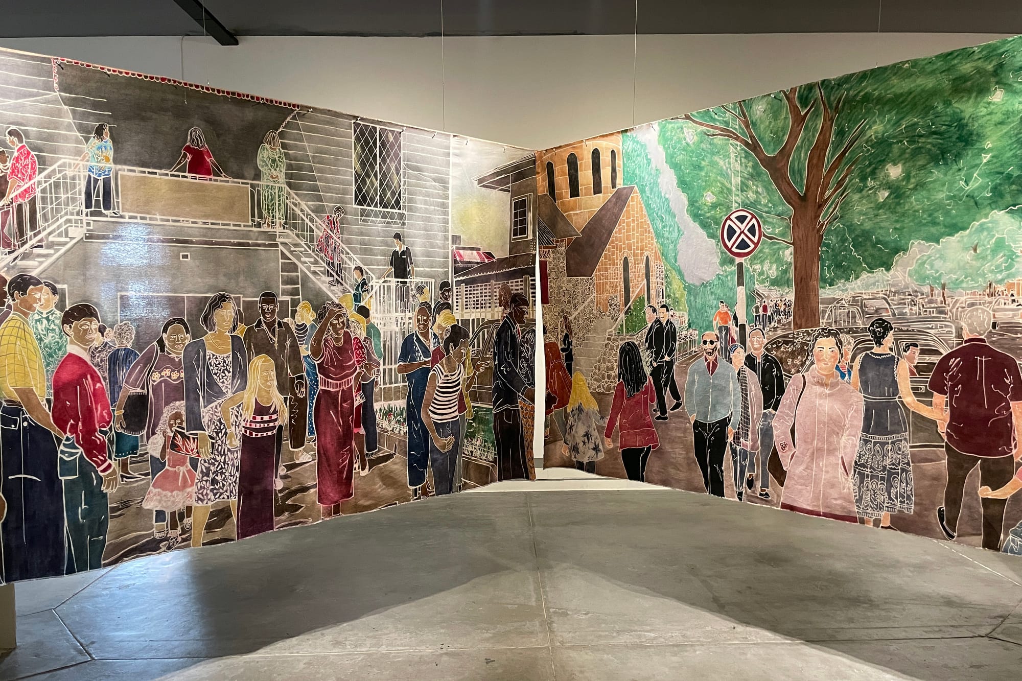 The only clear point of reference is modern-day Los Angeles, which can be identified by a large logo for the local Armenian-owned fast food chain Zankou Chicken. The logo, a giant “Z,” looms behind passersby in the installation “Within a Diasporic Architecture” (2024), an artwork composed of four batik-on-canvas panels that hang loosely from simple wooden structures, creating a private box in which to view the city scenes. There is nothing on the reverse side of the canvases, and no gap signaling where to enter the installation, so seeing the work requires one to brush a panel aside, like brushing aside a veil and crossing from the world of the living to the dead.