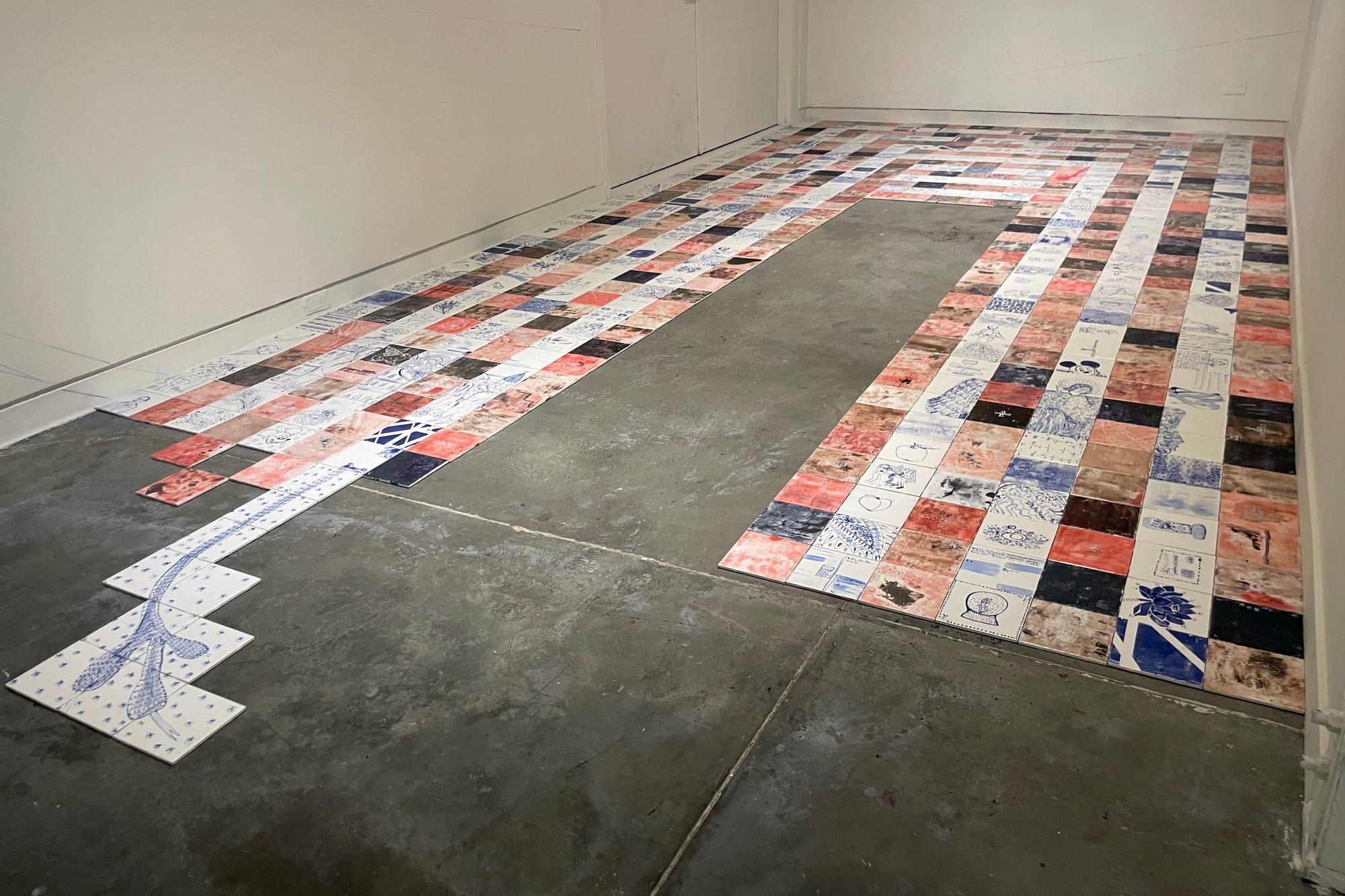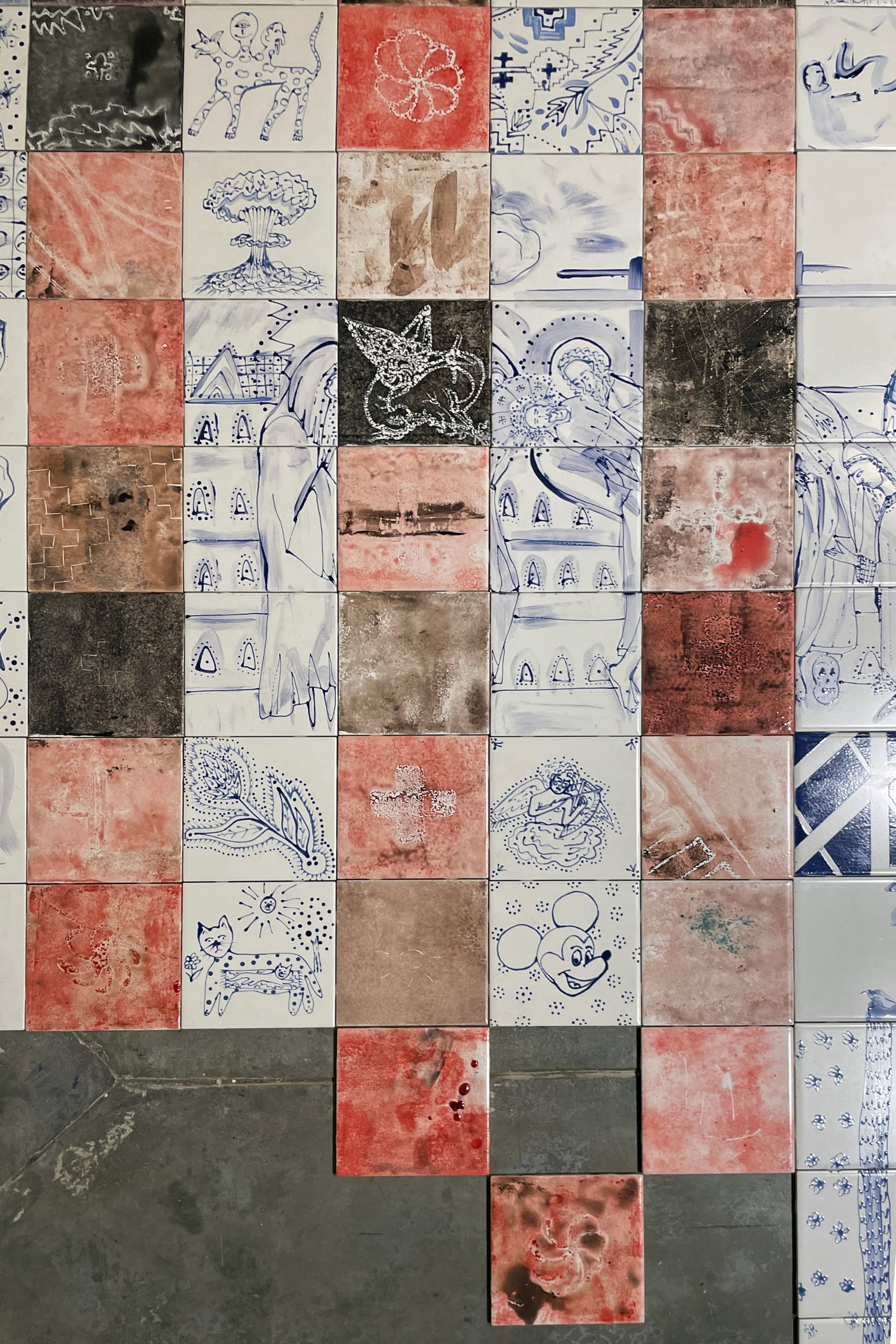 Indeed, Emenaker is as fond of ceramics as she is of batik and painting. She shaped large chunks of porcelain into beads to create “365 Prayers/ 365 Fists” (2025), an enormous rosary that hangs from the wall and drapes onto the floor. She also laid down glazed ceramic tile to create the mosaic path “Untitled Floor” (2024), which alternates between scenes rendered in traditional blue and white porcelain with designs painted onto variant brown earthenware. She paints haloed iconoclastic saints in her comicbook-like style, but also repeats motifs of bootleg Disney characters, cats, and exploding bombs — childhood memories seem to be intertwined with religion, greed, and war.