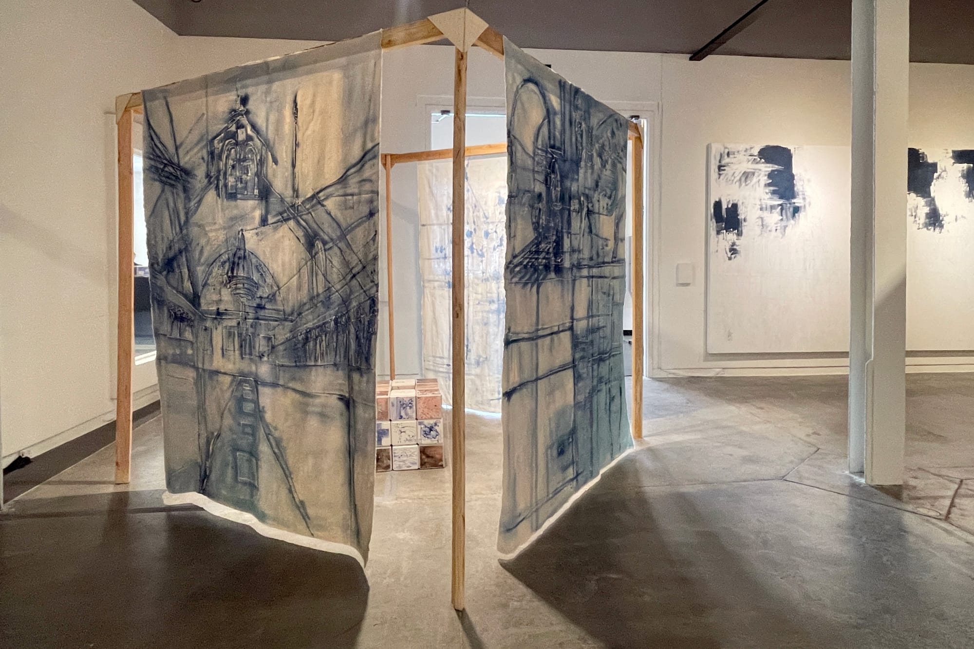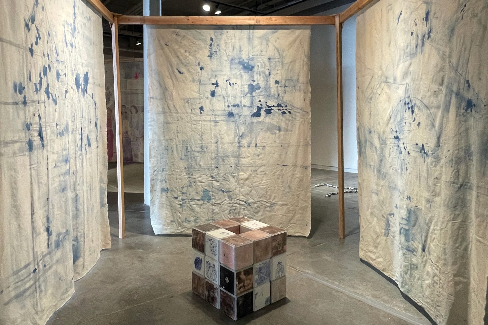 Religion reverberates throughout the exhibition. Another boxed-in batik installation comprises three individual works: “Traces #5,” “Traces #6,” and “Traces #7” (each 2025). The canvases, which face outward, look as if the artist transposed quick sketches into batik form, including church facades, interiors, and scaffolding. An echoing sound emanates from “Untitled” (2024), a squat, ceramic-tiled box at the center of the installation. The noises it produces aren’t distinct, suggesting a memory more than a sermon, but the ceramic structure looks like it could be the cornerstone for a historic church.