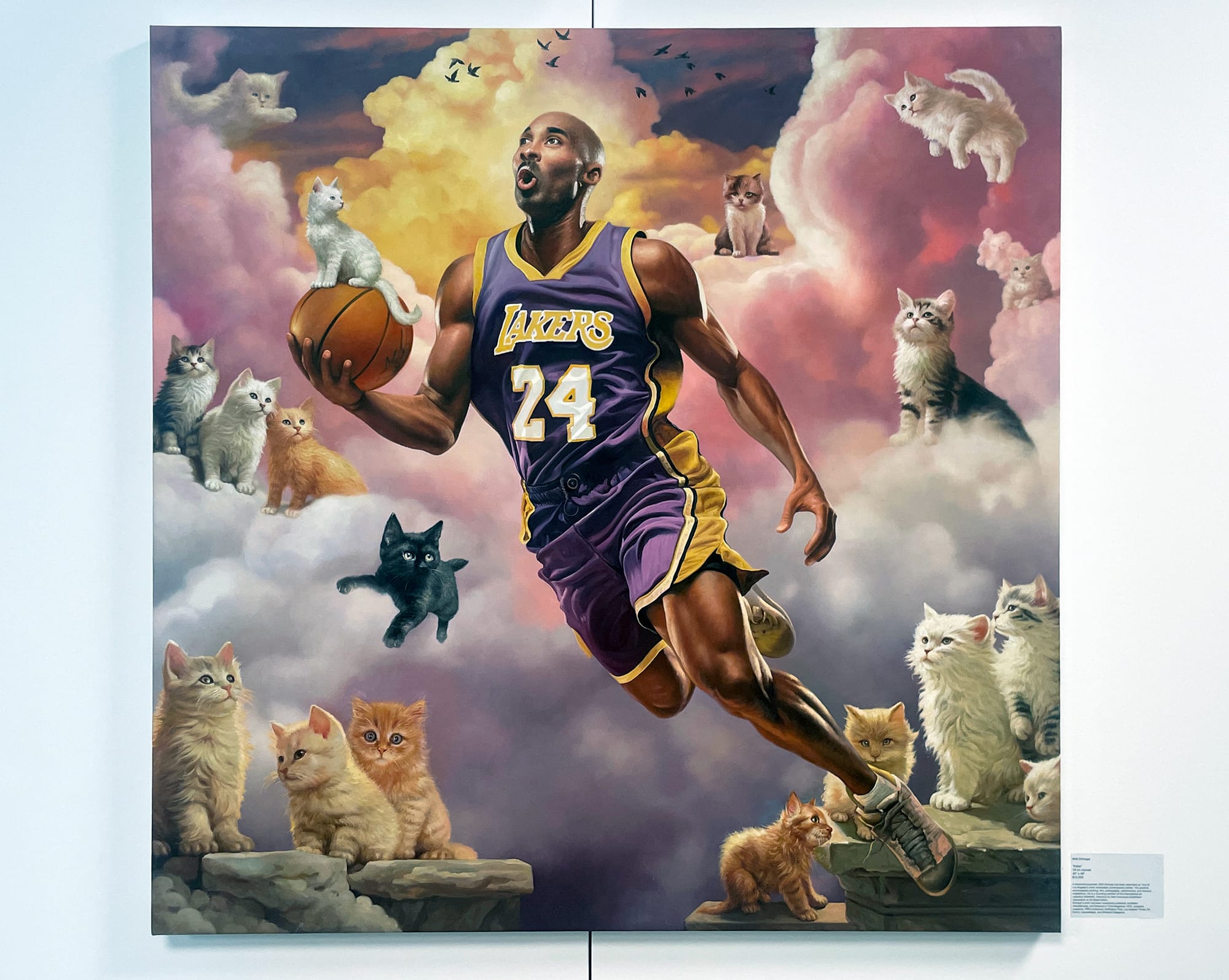 Though I’m famously a Dog Person, mostly due to my cat allergies, the Cat Art Show immediately hooked its claws into me. Before I even saw it in person, Instagram lured me in with Britt Ehringer’s “Kobe Entering the Kingdom of Kittens,” an oil painting that features the late Los Angeles Lakers basketball star floating among the heavenly clouds, surrounded by a chorus of curious kittens.