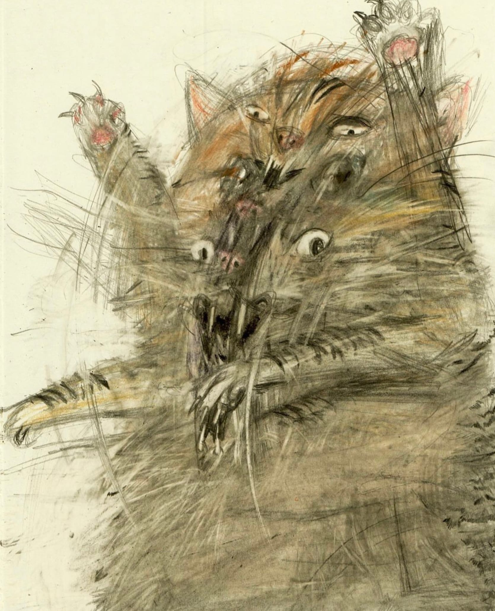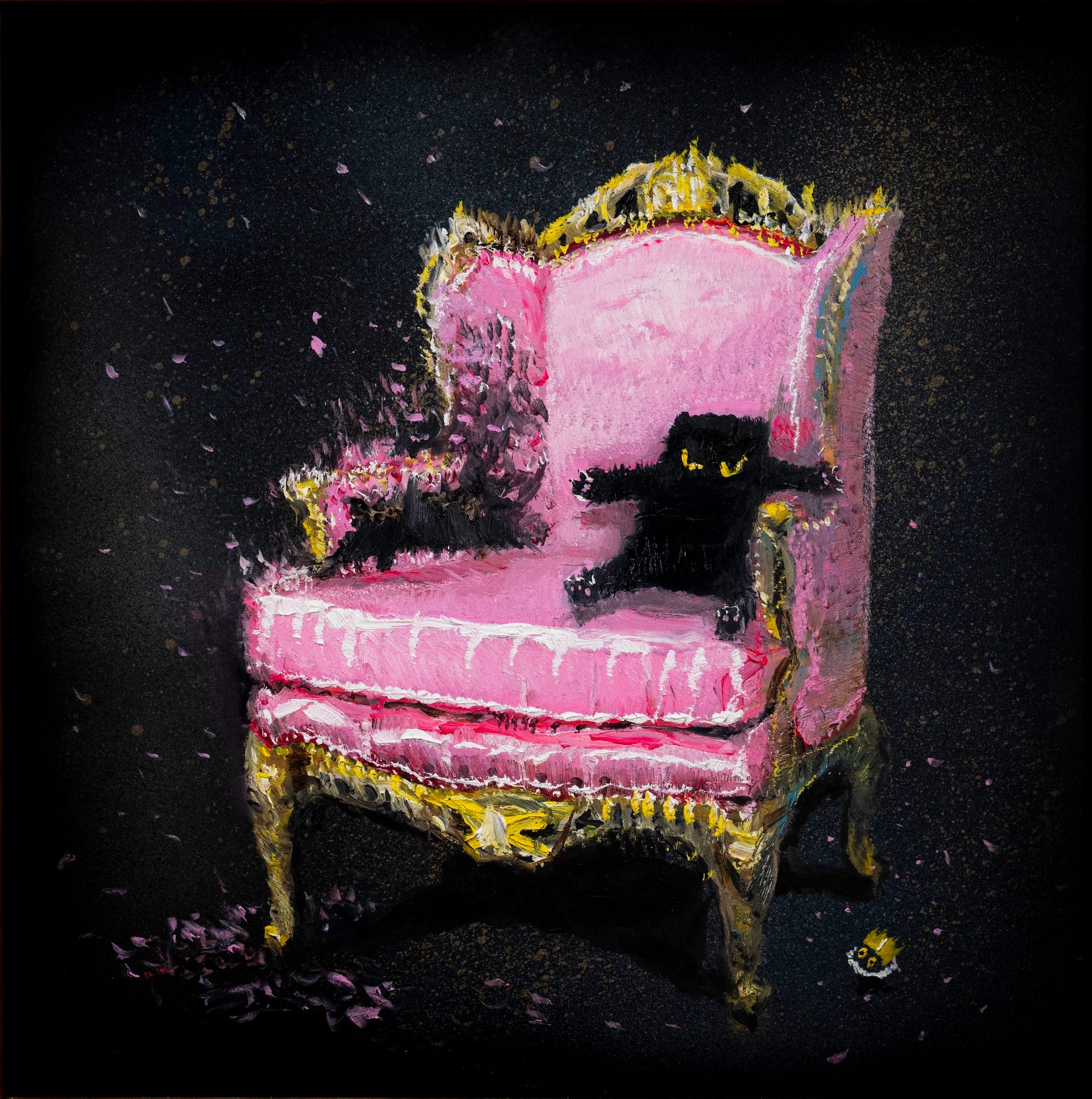 Other standouts included Leo Forest’s “Une Chat,” a frenetic charcoal and crayon drawing of a cat in motion, hissing and scratching; and the diptych “Cat and Mouse” by Tobias Keene, which placed an impasto cat in dialogue with a small mouse, the orange tabby separated from its prey by the borders of their ornate, gold frames. I was also charmed by the delicacy and realism in Sydney Swisher’s “Pevely,” where a long-haired cat perches on a sunlit floral sofa, the upholstery pattern blooming past the boundaries of the furniture.