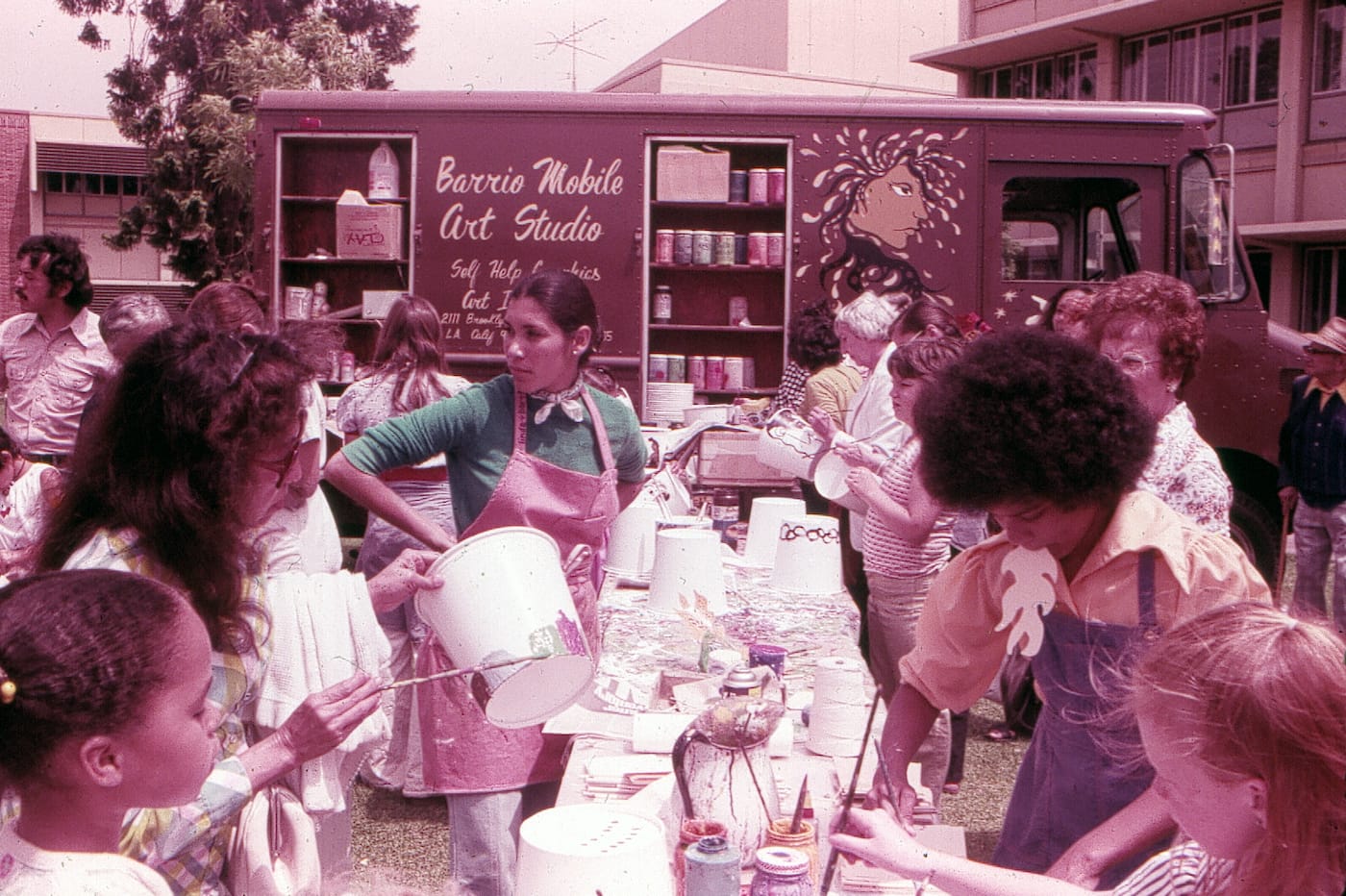 Fifty years ago, a Franciscan nun and printmaker and a group of Latinx artists founded Self Help Graphics & Art in an East LA garage. Sister Karen Boccalero (herself mentored by Sister Corita), Carlos Bueno, Antonio Ibáñez, and Frank Hernández were motivated to form the group by the lack of opportunities and facilities for young Latinx artists looking to develop their creative skills. Several influential Chicanx artists produced early prints at Self Help Graphics, including Carlos Almaraz, Barbara Carrasco, Yreina Cervantez, and Diane Gamboa. What began primarily as a printmaking workshop expanded to include other art forms, like performance art and music. From 1975 to 1985, a customized van dubbed the Barrio Mobile Art Studio would drive to elementary schools in East Los Angeles, teaching kids filmmaking, photography, sculpture, painting, and puppetry.
