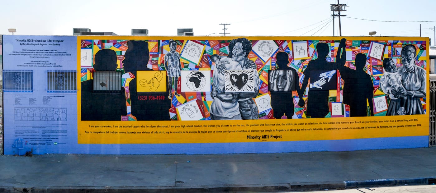 From 1988 to 2002, SPARC produced over 100 murals all over Los Angeles, working with almost as many muralists as part of the Neighborhood Pride Mural Program, which grew out of the "Great Wall" project. And in 2015-16, SPARC's Mural Rescue Program restored nine of those murals judged "historically significant" by LA's Department of Cultural Affairs. These include "To Protect and Serve" by Noni Olabisi, which pays tribute to the Black Panthers; "Love is for Everyone" by Mary-Linn Hughes and Reginald Zachary, painted outside the Minority AIDS Project Building in South LA; and a mural honoring crossover Mexican film star Dolores del Rio by Alfredo de Batuc in Hollywood.