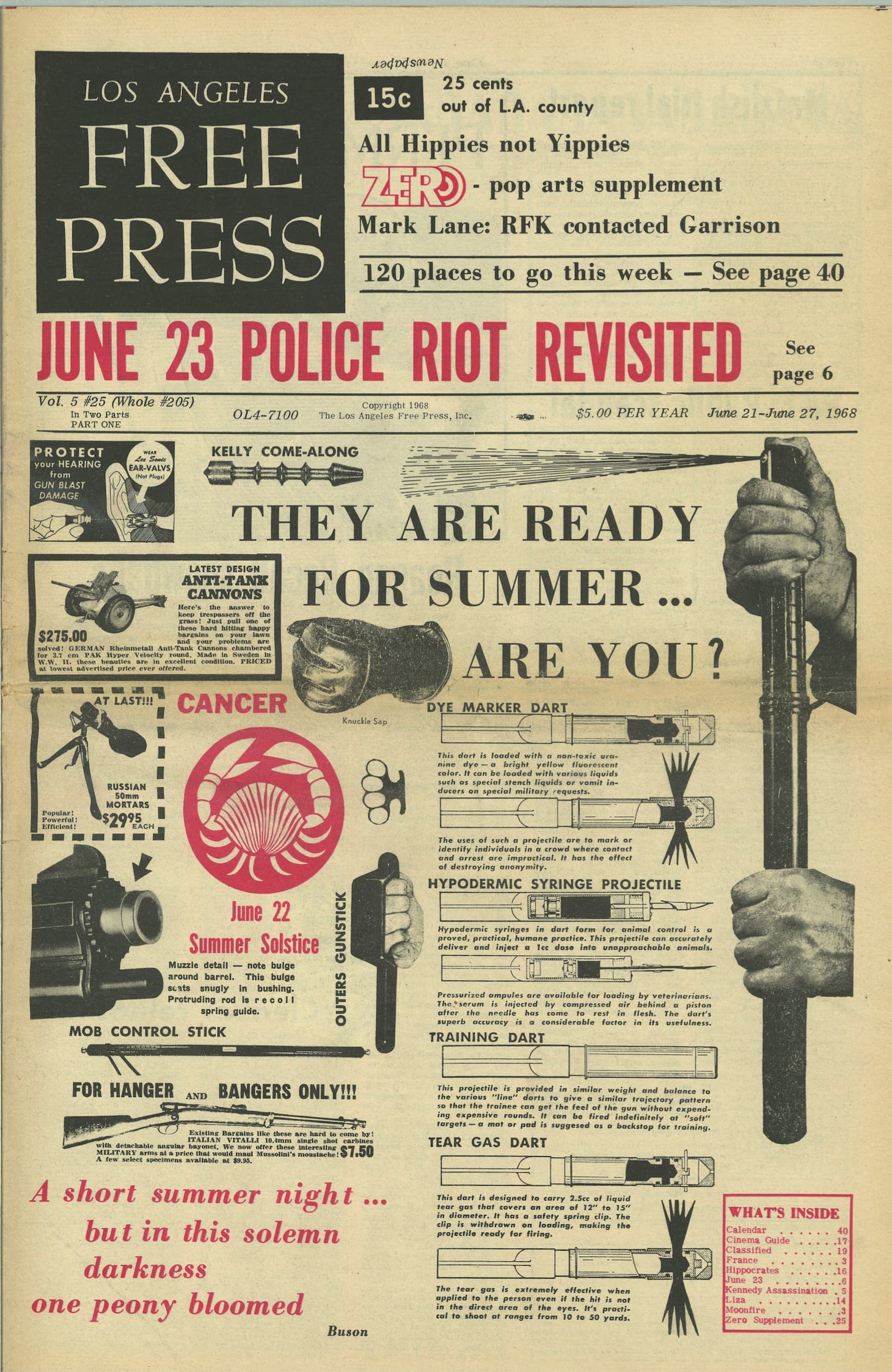 The Free Press framed protests as logical responses to rising unemployment, segregated schools, and decrepit housing conditions. Many of the city’s prominent newspapers were too conservative to publish stories from this angle, giving the Freep leverage in the communities it covered. Readership expanded so much after Watts that it devoted a special mid-week issue to the Century City police riots of 1967 — when unprovoked officers attacked Vietnam War protestors outside the Century Plaza Hotel as President Johnson launched his reelection campaign. “They are ready for summer … Are you?” an ominous headline reads, with a full-page design of riot gear and weaponry. A red Cancer symbol appears near a gun barrel and mob control stick to commemorate the summer solstice, and perhaps to amplify how things were heating up.