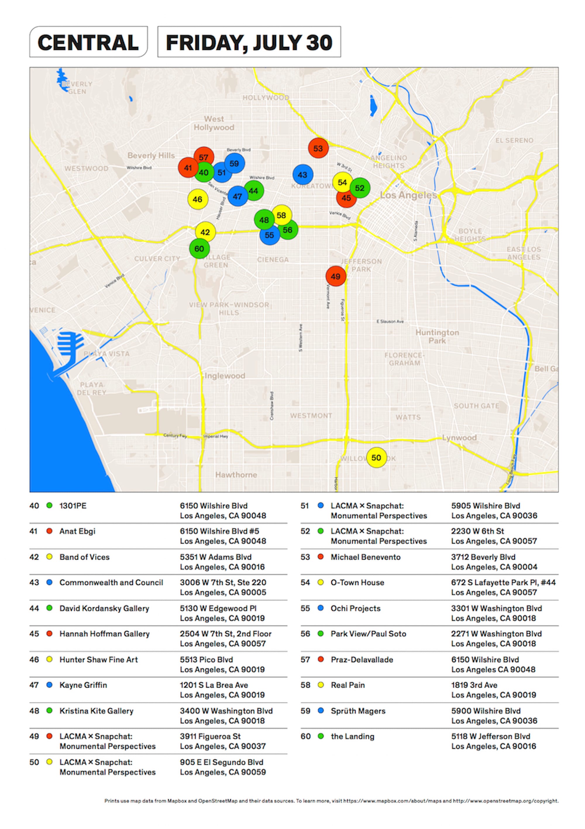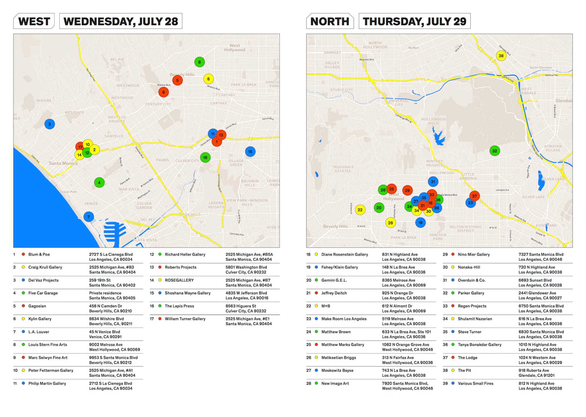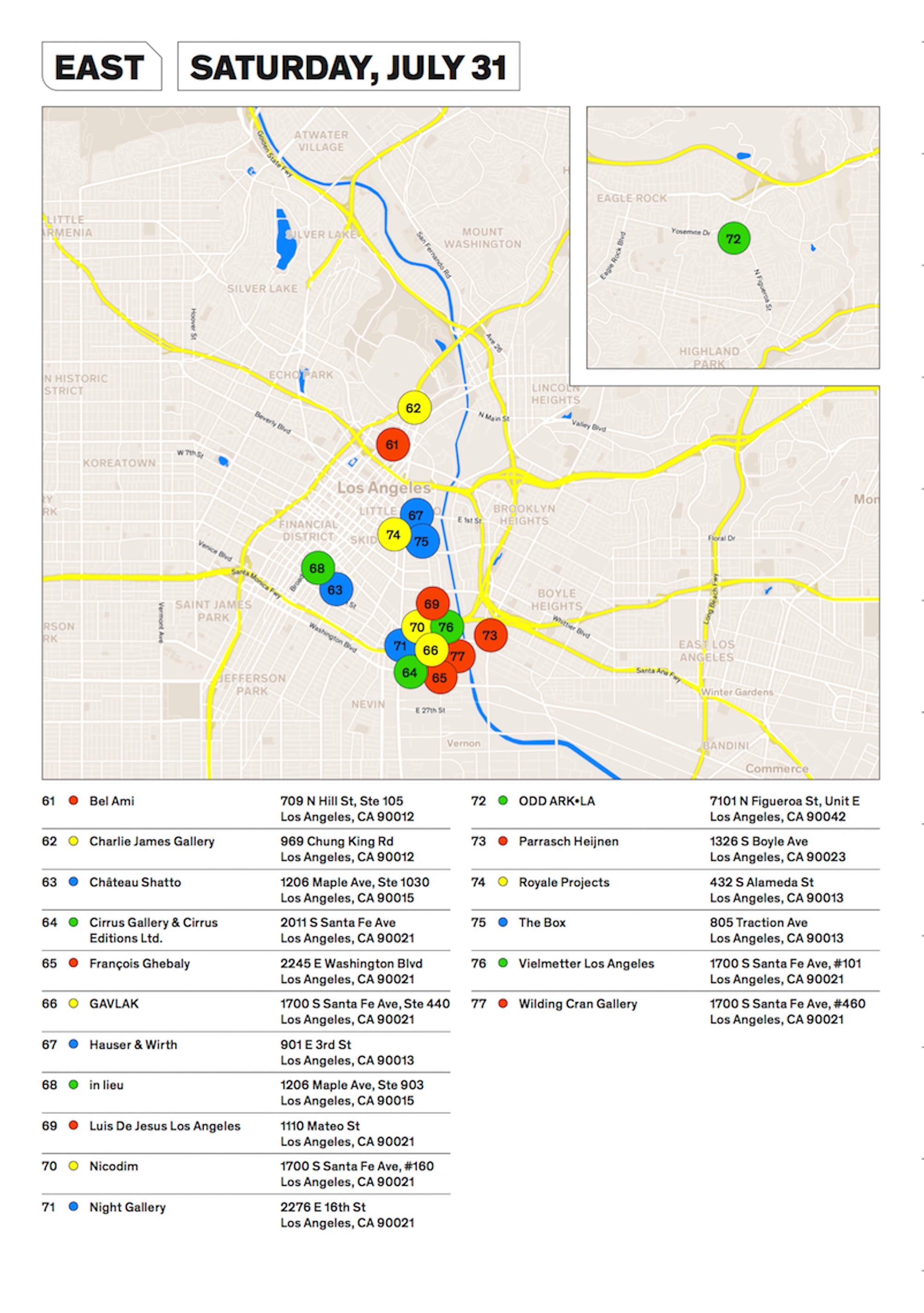 To better manage LA’s sprawling terrain, the organizers have divided the city into four regions: West, North, Central, and East. Although galleries will be open throughout the event, four “community days” will each feature programming and extended hours in a different area, beginning with the Westside on Wednesday, July 28, and moving eastward to conclude on Saturday, July 31.