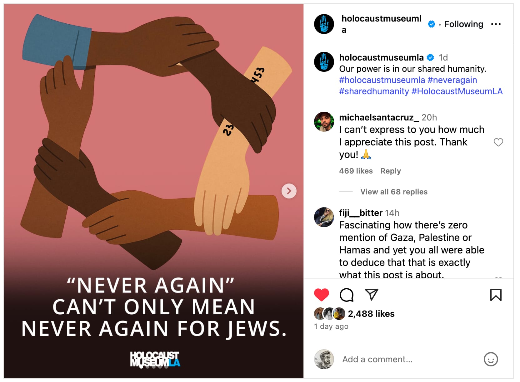 The Holocaust Museum LA, founded in 1961 by Holocaust survivors, is the oldest museum of its kind in the country. Its “Never Again” post — the first such statement from the institution — garnered more than 2,700 likes and 3,300 comments. The text continued on four slides: “Jews Must Not Let the Trauma of our Past Silence our Conscience. Standing with Humanity does Not Betray Our People. It Honors Them. To Be Jewish is to Remember And to Act.”