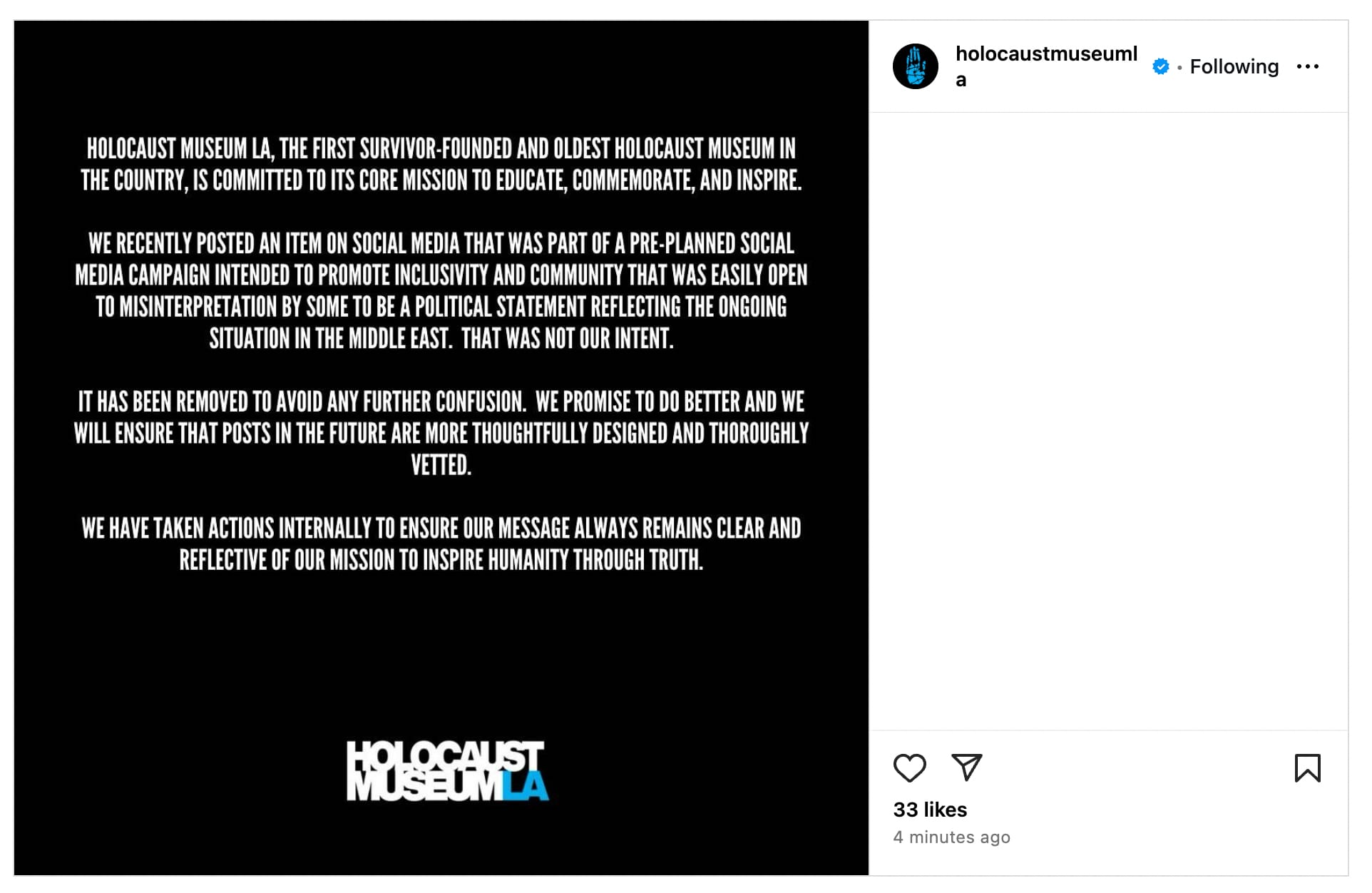 The Holocaust Museum LA deleted the post on Saturday and issued an apology, stating that it “will ensure that posts in the future are more thoughtfully designed and thoroughly vetted.”