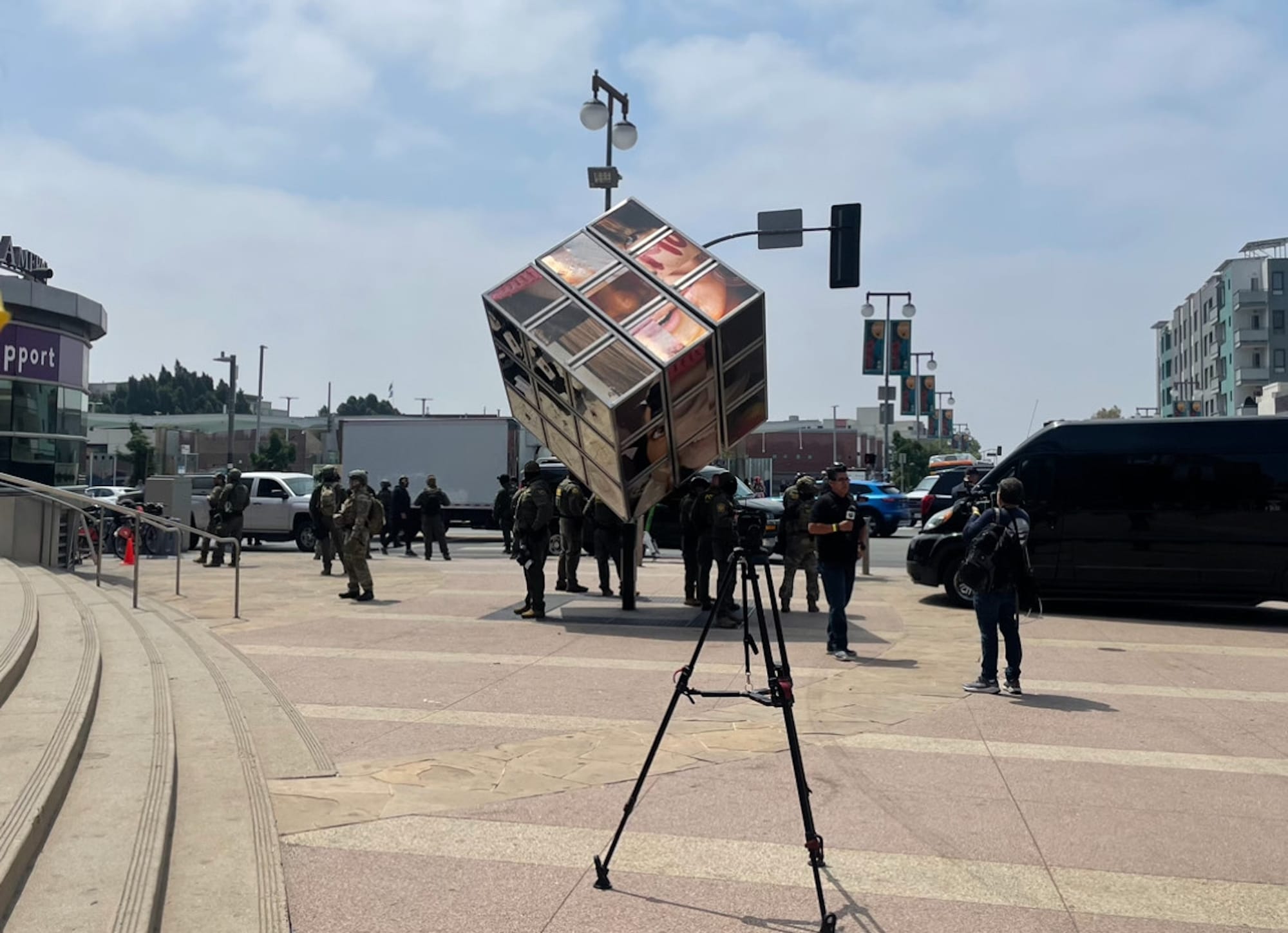Officers stood nearby Nicole Maloney's "OOMO Cube" (2014), where, ironically, members of the community had placed posters of individuals "disappeared by Immigration and Customs Enforcement," according to a museum spokesperson. Earlier this June, President Trump deployed the National Guard without Newsom’s consent in a move to quell protests against ICE raids in Los Angeles.