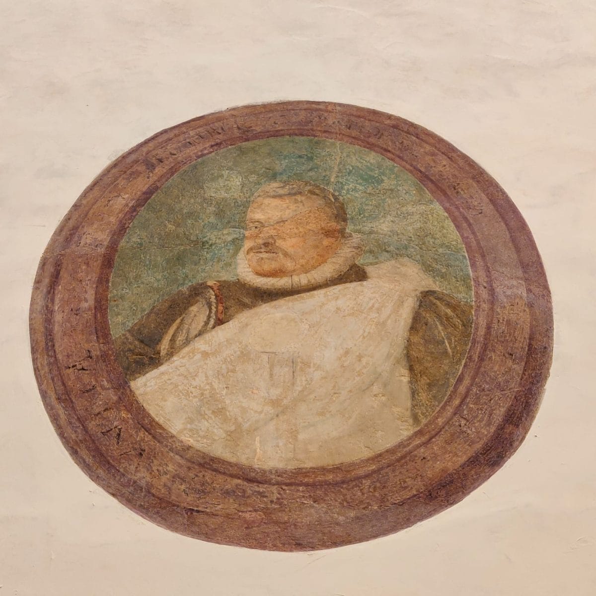The larger and more impressive of the two frescoes, attributed to the circle of Italian Mannerist painter Bernardino Poccetti, is a life-sized portrait of Cosimo II de Medici, the fourth duke of Tuscany and a patron of Galileo. At his feet are two women sitting beside a lion and a wolf, allegories of the cities of Florence and Siena.