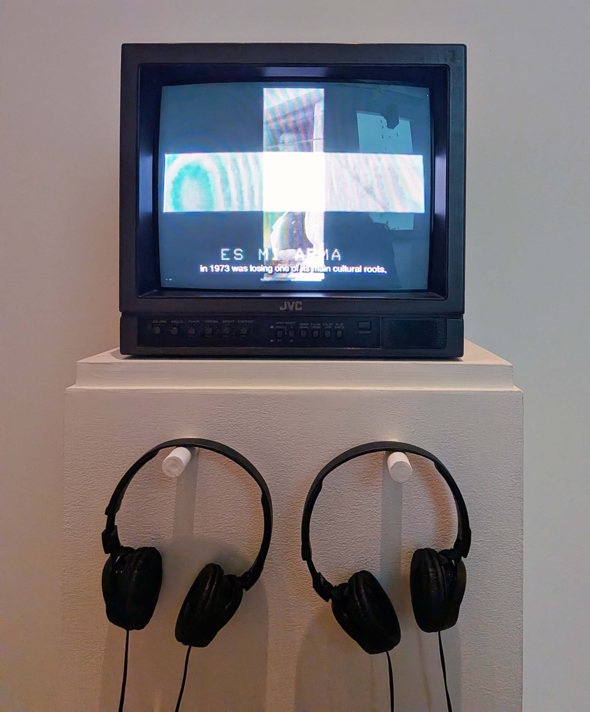 The line that is made to misbehave shows up across many works, like in the video “I - +” (1987), in which a horizontal band plays footage of her street crossings, slicing through a vertical column of state-controlled broadcast — including Pinochet rallies and Reagan-era posturing — to form a luminous cross. On a small TV monitor, the split screen reads as a quiet hijacking of the state’s visual field, punctuated by the intermittent scroll of the phrase “Esta línea es mi arma” (This line is my weapon), a caption that names Rosenfeld’s register of breach.