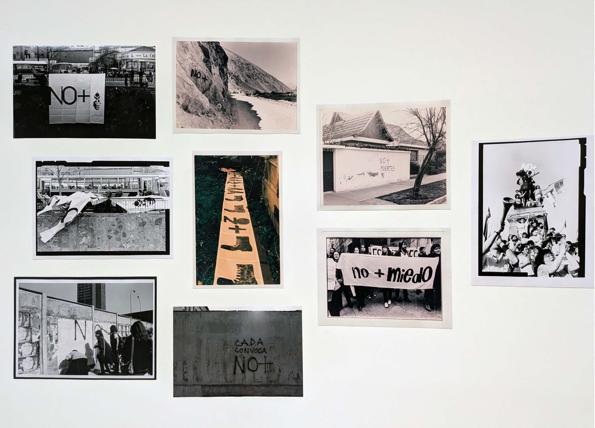For CADA, that meant refusing to let artistic discourse remain insulated from the social urgencies surrounding it and instead moving directly into the street — inviting participation, unsettling routines, and demanding visibility. This is most clearly seen in the national spread of the NO+ (“No more”) campaign, a slogan designed to be completed by citizens with their own demands and circulated across Chile through collective use. The exhibition echoes this distributive spirit by offering reprinted flyers and small NO+ pin — objects that demonstrate how the work gained force by being passed hand to hand.