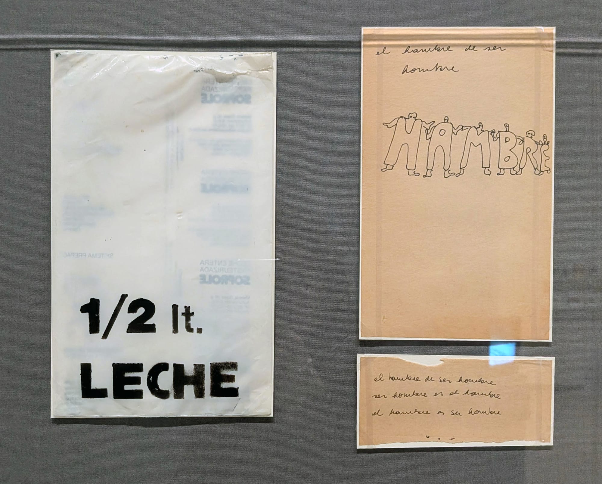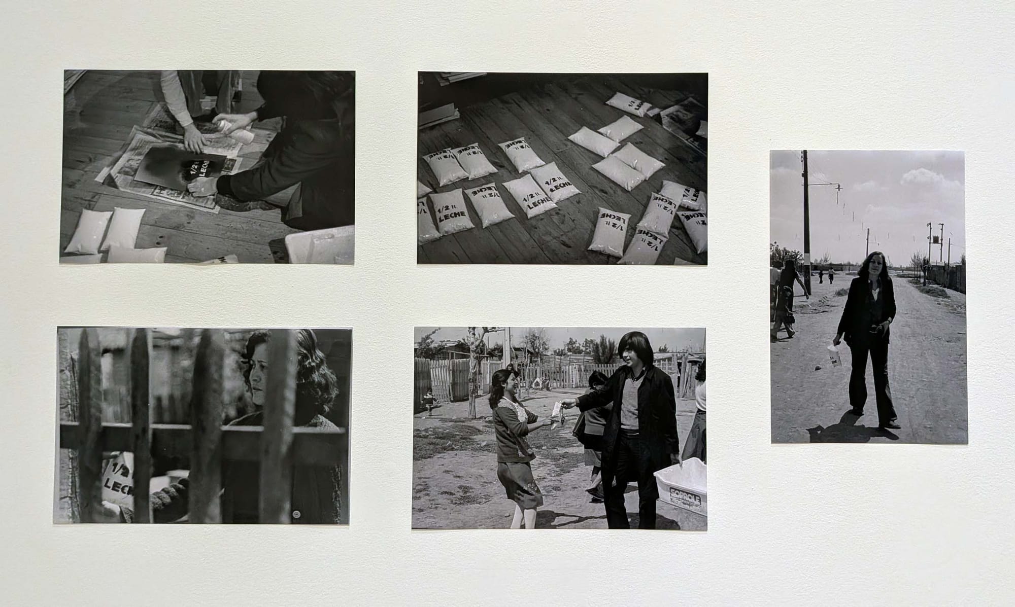 Disobedient Spaces emphasizes the networks of exchange and mutual support that shaped Rosenfeld’s practice. Moments when Rosenfeld worked alongside Cecilia Vicuña and writer Diamela Eltit situate her within a network where activism and poetry were mutually sustaining. Archival posters, pamphlets, and correspondence document Rosenfeld’s work as a founding member of Colectivo Acciones de Arte (CADA), including "Para no morir de hambre en el arte" (How not to die of hunger in art, 1979), when the group redistributed bags of milk in low-income neighborhoods of Santiago. Milk carried particular weight in Chilean public life. It was central to Allende’s nutrition programs, and under Pinochet’s dictatorship, it transformed into a marker of scarcity and a symbol of the rapid dismantling of social welfare.