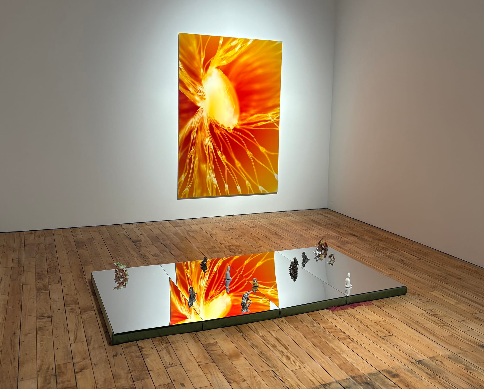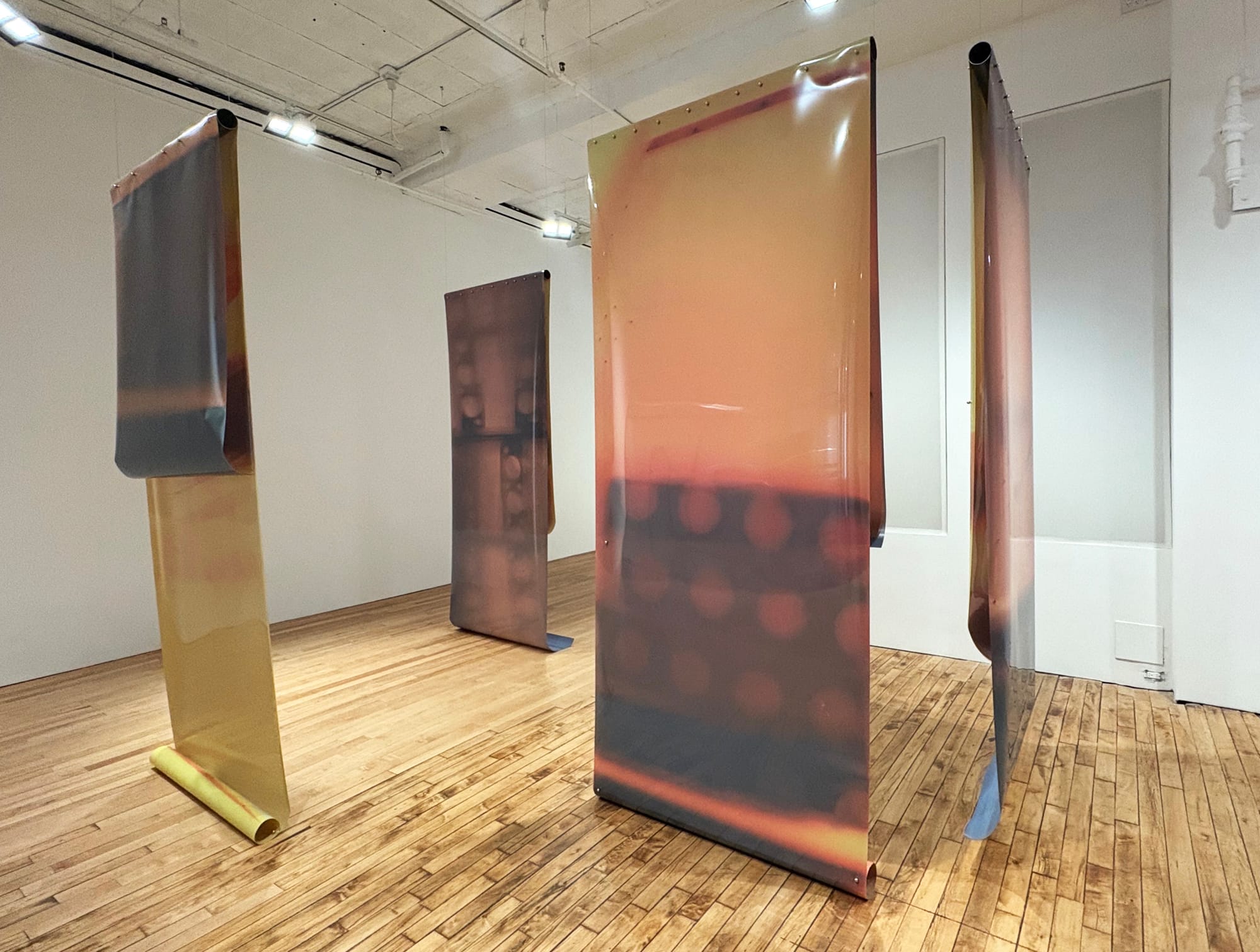 Draped on industrial cables behind this installation are dramatic scrolls of film that continue to change slowly as they are exposed to light. In “Molt,” Kang relinquishes control to the elements while maintaining immaculate precision in composition. The film’s gradients, ranging from a sooty brown to luminous peach, evoke a metropolitan skyline at sundown or a skeletal X-ray scan. Like the spotless mirrors that cover the surfaces of neighboring sculptures, Kang's mercurial photo negatives invite viewers' projections to complete the work.