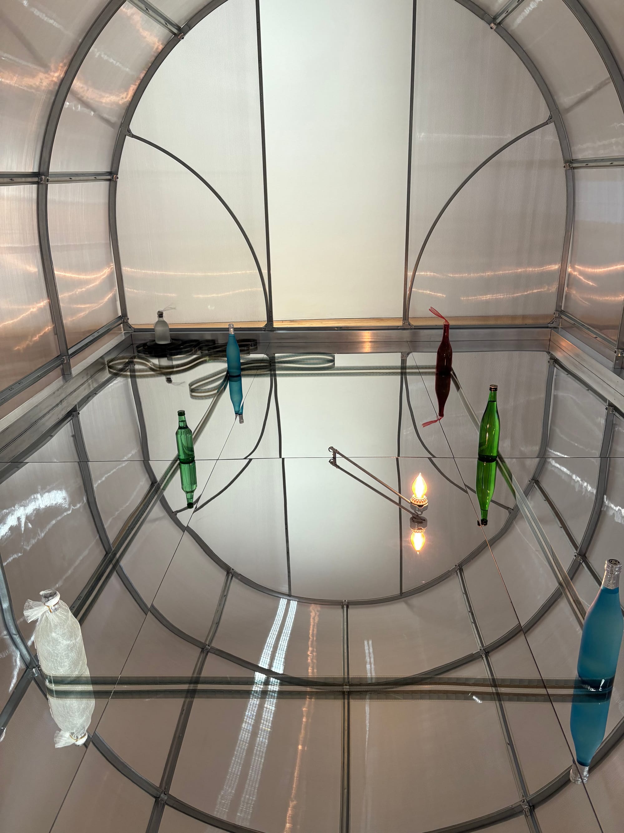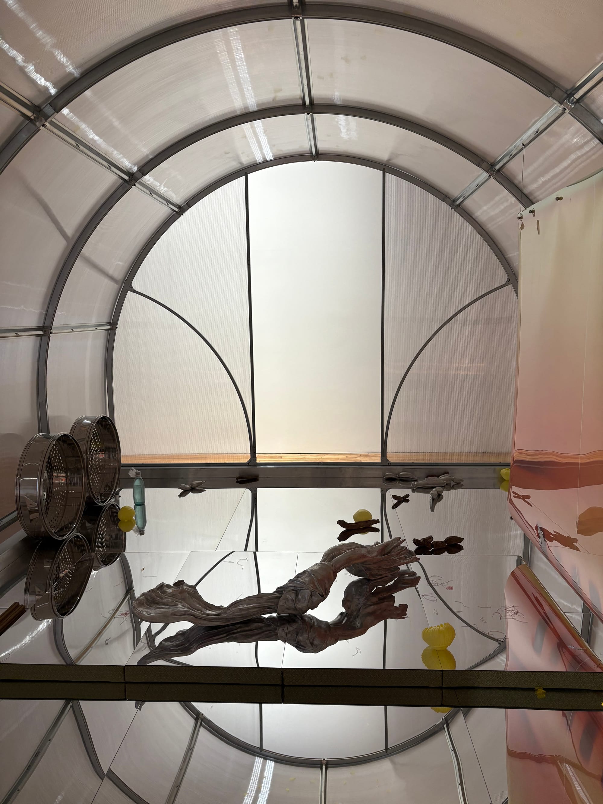 Anchoring opposing sides of the gallery are two identical steel greenhouse structures titled “Receiver Transmitter” (2025), which form the shape of a bisected tunnel. They provide a glimpse into Kang’s process of tanning large lengths of film for other nearby works, such as those in the Molt series (2024–25), whose patterns are shaped by the bright light within the greenhouse. In the gallery, they have been drained of warmth and sunlight; nothing grows inside. In fact, they hold the inverse of abundance: Styrofoam fruit nets still pregnant with the void of what they once held, dried lotus tubers, lonely liquor bottles, and porcelain bird figurines with mouths agape. Defying expectations, the arched architecture instead feels like a mechanical throat, as suggested by the work’s title, provoking a shudder when we are within its cold and silent vice.