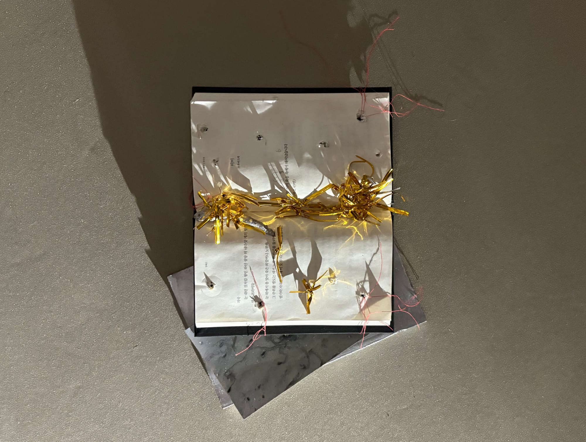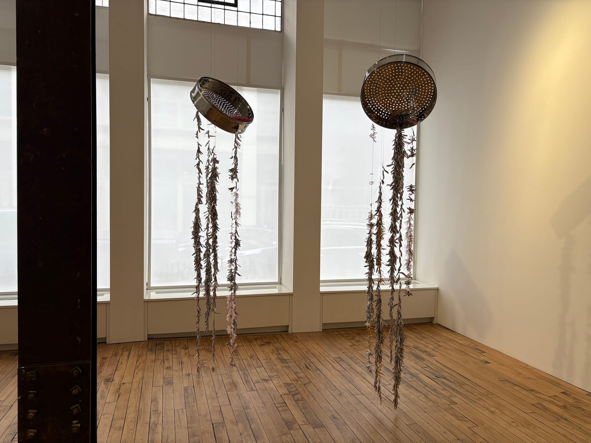 We are greeted by what appears to be a pair of metal drums suspended from the ceiling upon entering Lotus L. Kang’s exhibition Already at 52 Walker, curated by Ebony L. Haynes. Their musical potential, quieted for now, is instead visualized through sharp metal forms tumbling vertically downward. A closer look reveals that these quasi-chimes — they have functioned as such in previous iterations — are cast into the shape of anchovies, their slender bodies riddled with holes before being strung together as casually as flower chains. And the steel drum is not a drum at all, but a kitchen steamer. Is this a scene of ceremonial death, of objects methodically leeched of their function? Or a firmament of collective possibility — the music to be made, the dish to be shared?