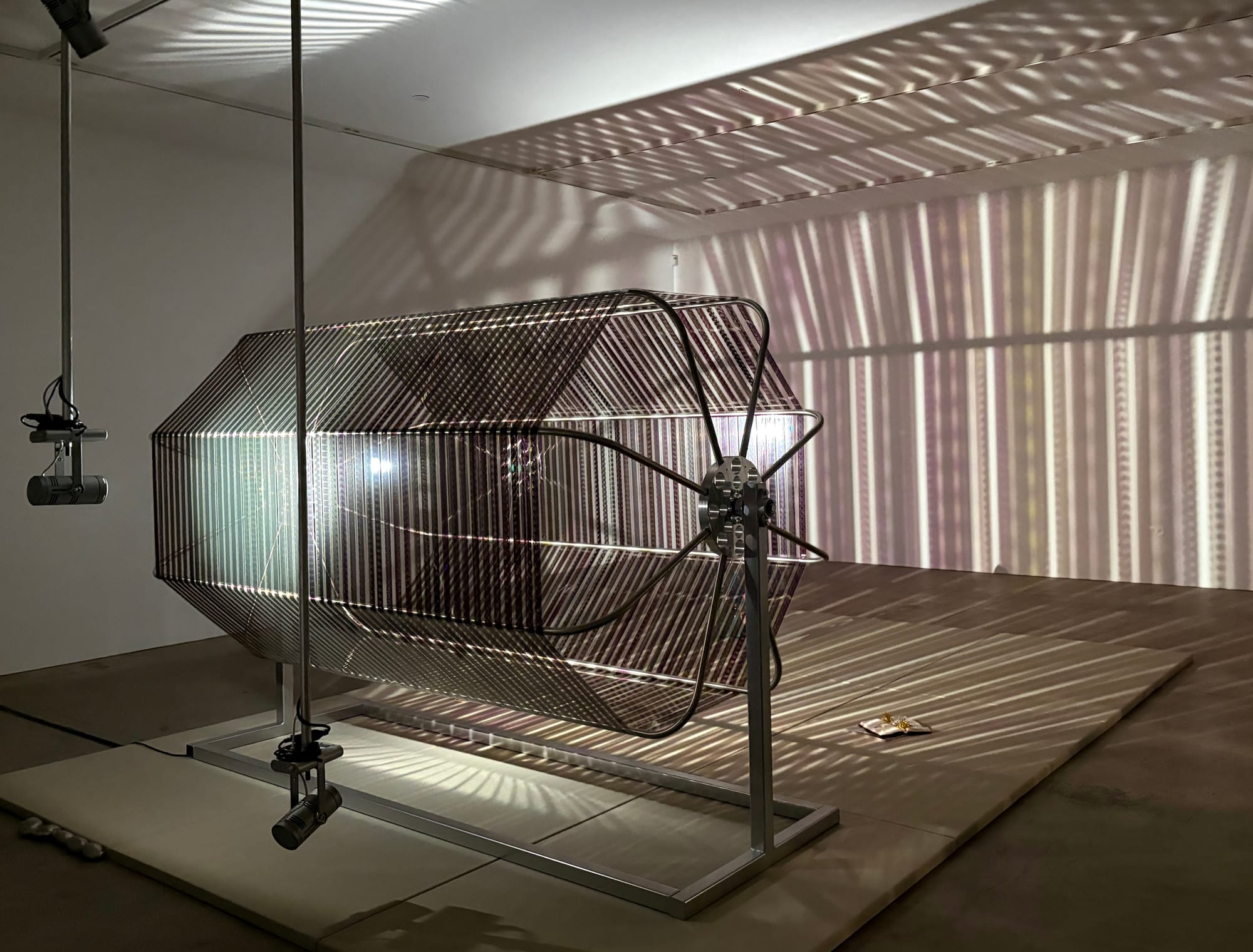Descending the gallery stairs, one passes through a dense forest of industrial bookshelves — the gallery's library collection — in order to view Kang's magnum opus, “Azaleas II” (2025). The work spins transparent film around a metal frame, projecting ribbons of subdued color around the room's perimeter. Echoing the dipoles of earlier work (skeletal and architectural, illuminated but dark, punctured but womb-like), it also contains a page from Autobiography of Death (2018) by Kim Hyesoon, which supplies the show's title, according to the press release. The poem has not yet been translated from Korean, defying easy interpretive meaning in this context for those unfamiliar with the language, just as the 35mm film that rotates around the dryer's axis divulges no legible meaning, revealing upon close inspection only the blossoms of purple orchids. To desire understanding, to ask what it all means, is to be invited to dive into the archives, as Kang clearly has done through rigorous historical and material research.