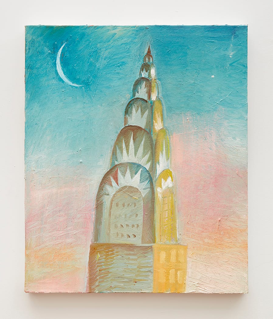 Taking its name from a 1959 doo-wop song by the Fleetwoods, Come Softly to Me announces the show’s lens and scope in its title: an invitation into Fratino’s gaze as hazy scenes drift into focus and unfold before him. He establishes this mode of looking and seeing in the first two paintings. The self-portrait “Me” is thrown into direct conversation with “Chrysler Building, Moon” by the glimmer in Fratino’s eye — the twinkling outline of the skyscraper itself.