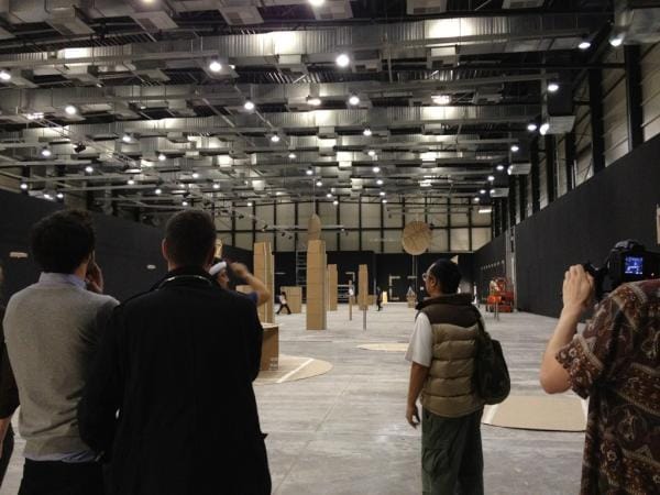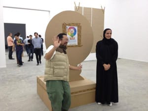 Interestingly, the Kusama/Jacobs collaboration coincided with a story about a supposed “new work” by former LV collaborator Takashi Murakami’s newly unveiled installation at Qatar Museums Authority, which witnessed a departure from the Japanese artist’s signature Superflat subject matter. Gone are the masturbating shonen cowboys and acid-trippy flowers, replaced with compositions constructed of cardboard and backdrop paper. Are we witnessing a new style from the Japanese Andy Warhol? Not quite. It turned out to be a deadpan post, and the expected kawaii art works will be on display. But I think it says something that we at Hyperallergic were more excited to see a ramshackle installation over a played-out explosion of Superflat.