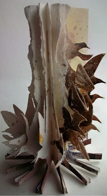 Simply, these book sculptures are lovingly animated, delicate examples of bindery and paper-experimentation. Like other book sculptures, her work is fascinatingly fragile, illustrating the fragility of analog literature itself. And uniquely, Boyd’s work illustrates the fragility of nature and the (lost?) art of bookmaking.
