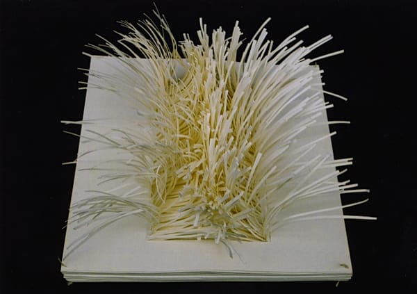 Boyd’s book-art asks this question sculpturally. She makes work with water-colored landscapes, folded birds flying from the print. Others are furry, exploratory works of chipped paper. All are mysterious and delicate, haunting and harsh. Her method of chipping away at book pages is jarring. In her series titled Paper Manipulation, thinly sliced guts stream from the heart of a book.
