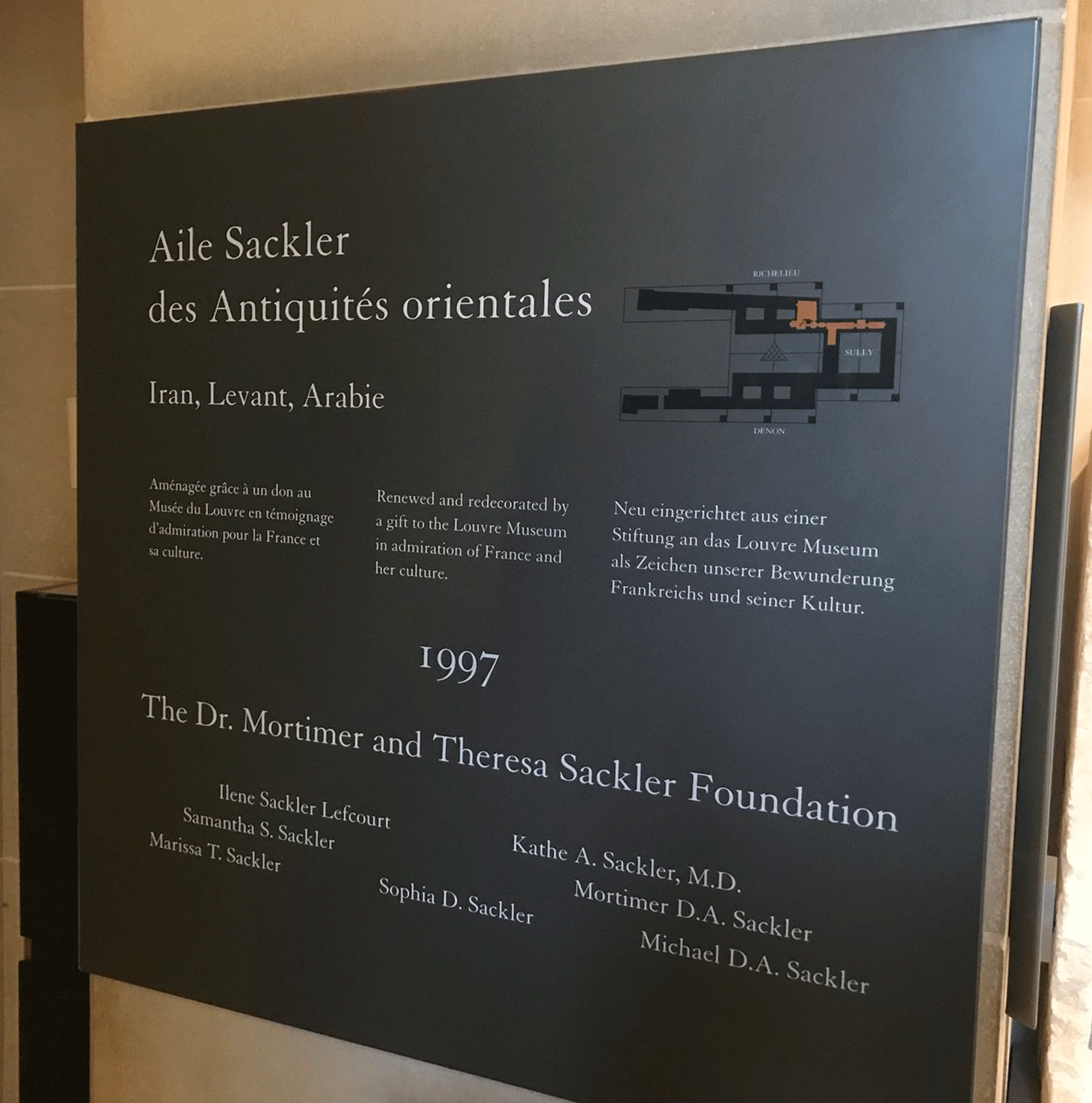 “We protest against this attempt to rewrite history and call on Jean-Luc Martinez to rectify his statements as soon as possible in order to make official the removal of the Sackler name from the Louvre,” PAIN Sackler said in its statement. “However, we, P.A.I.N., take the liberty of anticipating this official announcement which may never be coming, and announce that the Sackler name, in the 12 rooms of the Louvre’s Wing of Oriental Antiquities, has been removed.”