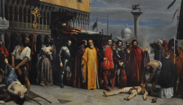 Alexandre Hesse, “Honneurs funèbres rendus au Titien, mort à Venise pendant la peste de 1576 (Titian’s dead corpse, in Venice during the plague’s epidemy in 1576)” (19th C.).