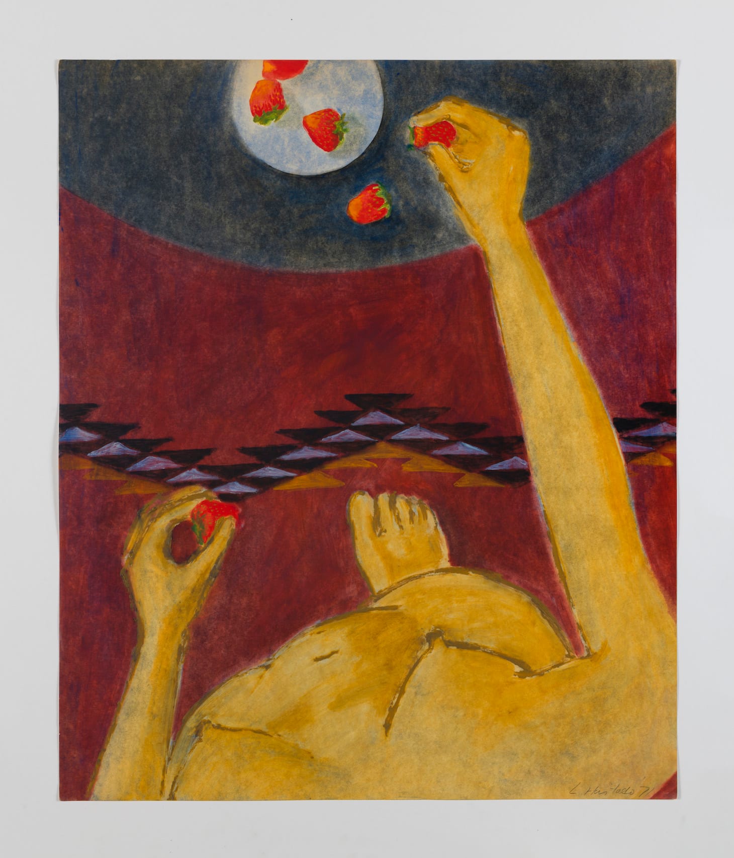 As a mother in the mid-20th century, Hurtado worked in the wee hours, often on the dining room table. When her third husband, the artist Lee Mullican, accepted a teaching position in Chile in 1968, the only space she had for a studio was in a closet. Instead of being stymied, she created perhaps one of her most intriguing series, the “I Am” self-portraits. These were not painted from a mirror, but by looking down at her own body, so that her contours become the contour of a landscape. Using herself as a model was part of her self-sufficiency. We can see shafts of light coming into the closet, as well as private acts, such as smoking a cigarette. She said of these landscapes: “this is the world, this is all you have, this is your home.”