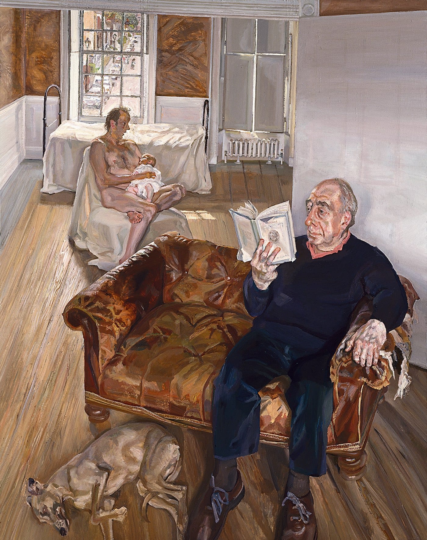 The transexual nature of the image, which Freud treats entirely casually — Dawson is set far back in the room, while the writer Francis Wyndham dominates the foreground, relaxing on a leather love seat with a book of Gustave Flaubert’s letters, as Pluto, again asleep, curls at his feet — uncannily plumbs the heart of one of today’s fiercest cultural debates. Completed more than 20 years ago, Freud’s intentions for the painting, as Auping puts it, weren’t “about gender but [to portray] an intimate, tranquil moment: the man absorbed in his book, the sleeping dog, the figure gently breastfeeding the baby.” He then quotes Freud: