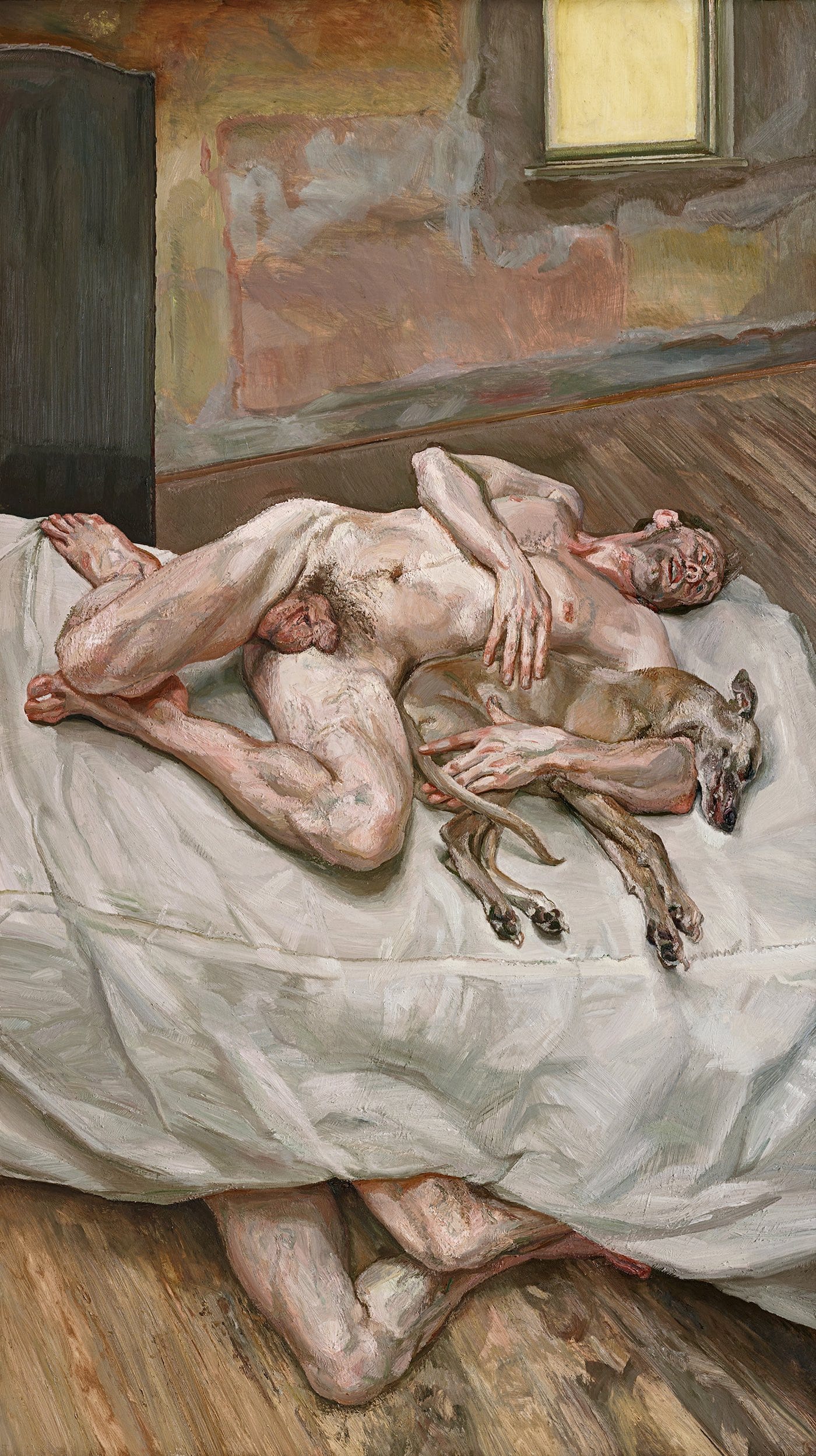 Other works are simply strange, like the well-known “Sunny Morning—Eight Legs” (1997), on loan from The Art Institute of Chicago, in which David Dawson, Freud’s longtime assistant and an artist in his own right (who curated the current exhibition), sprawls naked on a bed (or a platform done up like one), embracing a sleeping whippet named Pluto, while a pair of legs (also Dawson’s) is glimpsed on the floor beneath the sheets. In his essay for the exhibition catalogue, Dawson writes that the legs were added because “the painting demanded a sort of drama” — a capricious gesture made convincing solely through the solidity of the paint.