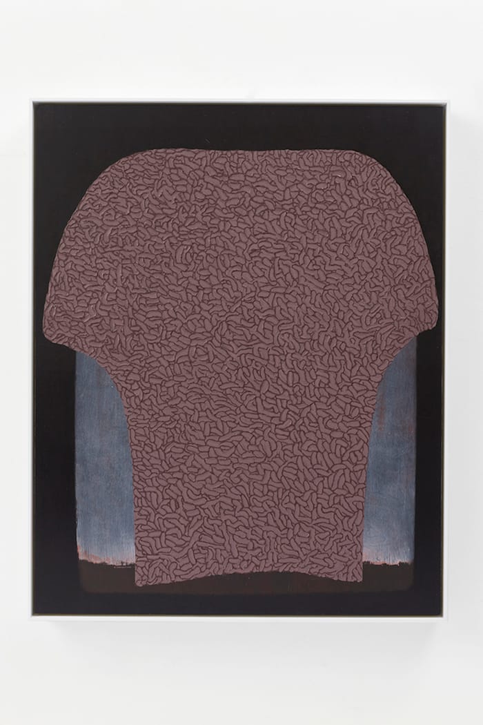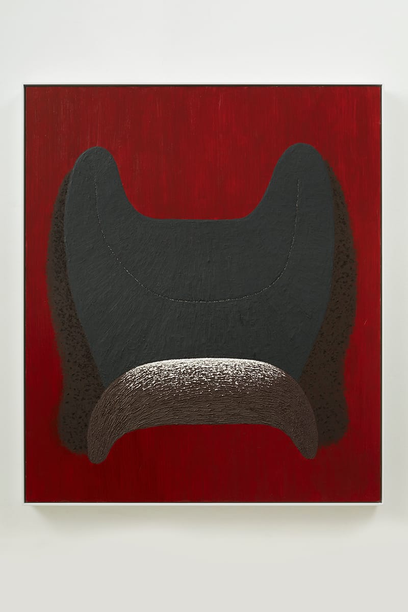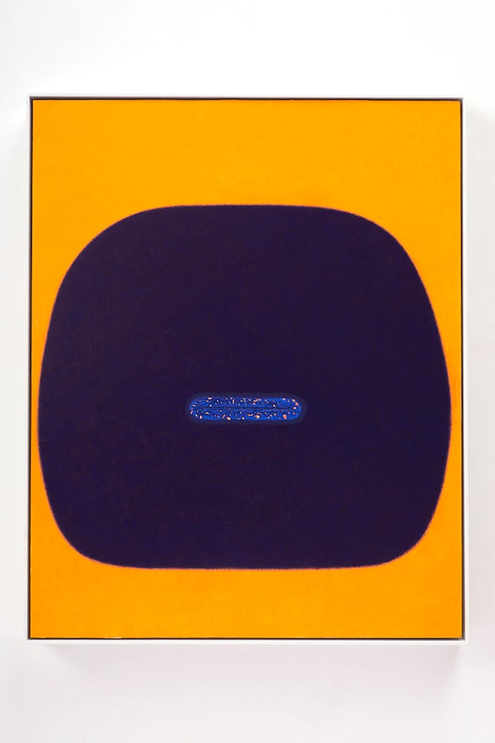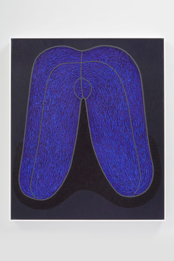 While the symmetrical blue form in “Skin VII” (2016) suggests a wig, everything about its grooved surface and the fuzzy black area between its two conjoined halves denies that interpretation. In fact, the fuzzy black surface introduces a weird erotic component to our experience of the painting. This reading is further complicated by the variegated surfaces, which invite physical intimacy, while the seemingly familiar form remains remote. The textured surfaces suggest skin, but the creature it belongs to remains incomprehensible.