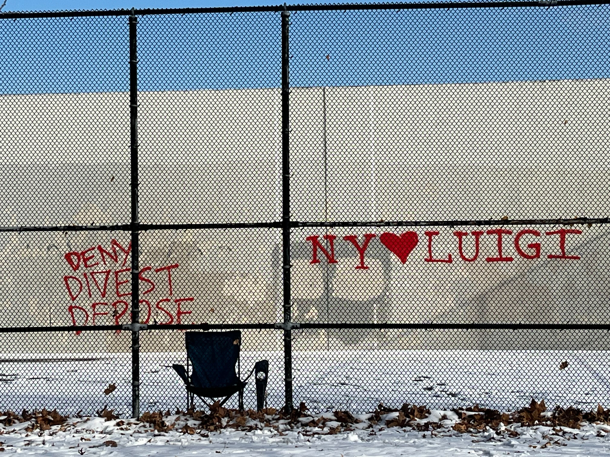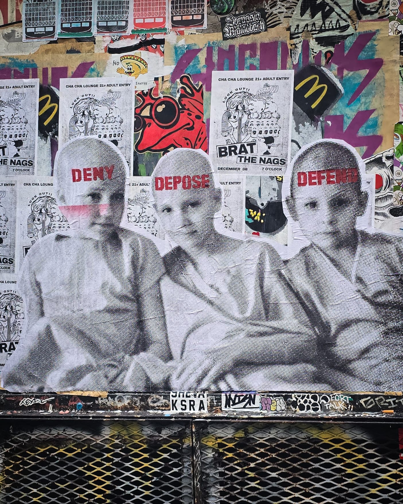 Nearby in the same alley, subSpace also pasted portraits of three young cancer patients, each bearing the words “deny,” “defend,” and “depose,” which police said were inscribed on the casings of the bullets that killed Thompson on December 4. The terms are also linked to Jay Feinman’s 2010 book Delay, Deny, Defend, which exposes how insurance companies avoid claims and has climbed to the top of bestseller lists in recent weeks.