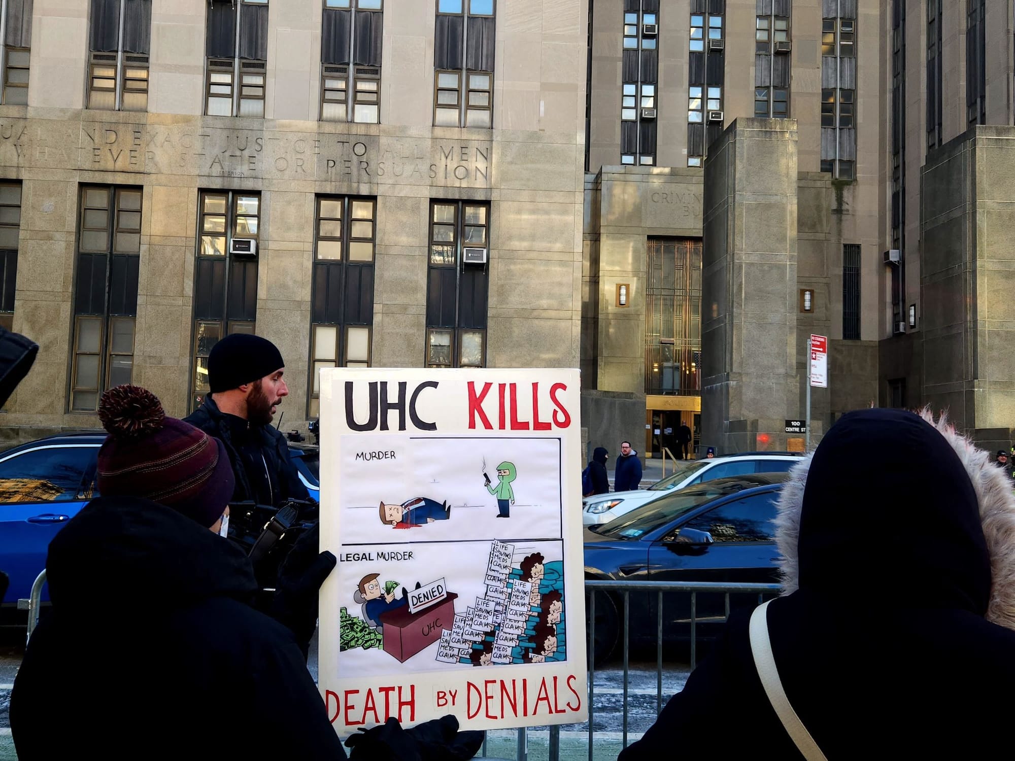 In a march for healthcare reform and in support of Mangione in Lower Manhattan on December 23, one demonstrator's sign depicted a cartoon illustrating "death by denials."