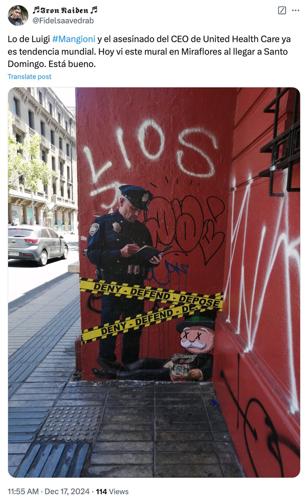 Last weekend, local media reported that a hand-painted pink billboard reading “Free Luigi Mangione” emerged along an interstate highway near Los Angeles, California. Users on X shared recent street art featuring the Luigi video game character in Alberta, Canada, and Columbus, Ohio. On Reddit, others shared images of a spray-painted wall with the phrase “Deny, Delay, Defend” in Tuscon. Another X user claimed to see a street artwork with the same words in Santiago, Chile. Hyperallergic has not been able to verify the authenticity of the latter. Some Mangione-inspired art circulating on social media has been flagged as AI-generated.
