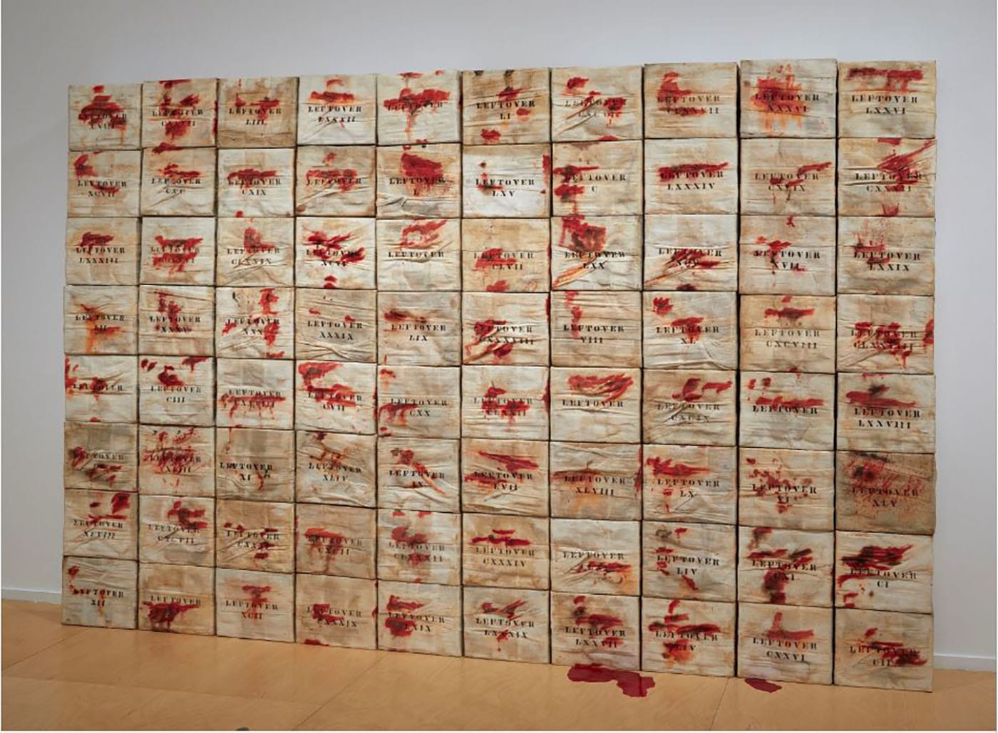 MADRID — At the Museo Reina Sofía, the artist Luis Camnitzer has piled up a grid of 80 blocks, approximately 12 by 12 inches each, and wrapped them in brown gauze. Imprinted with the word “LEFTOVER,” followed by a Roman number, each block appears to have been shot, dripping fake, plastic blood on the museum’s floor. The piece, “Leftovers” (1970), is an homage to those of Camnitzer’s generation who died in the hands of the Uruguayan repressive state.