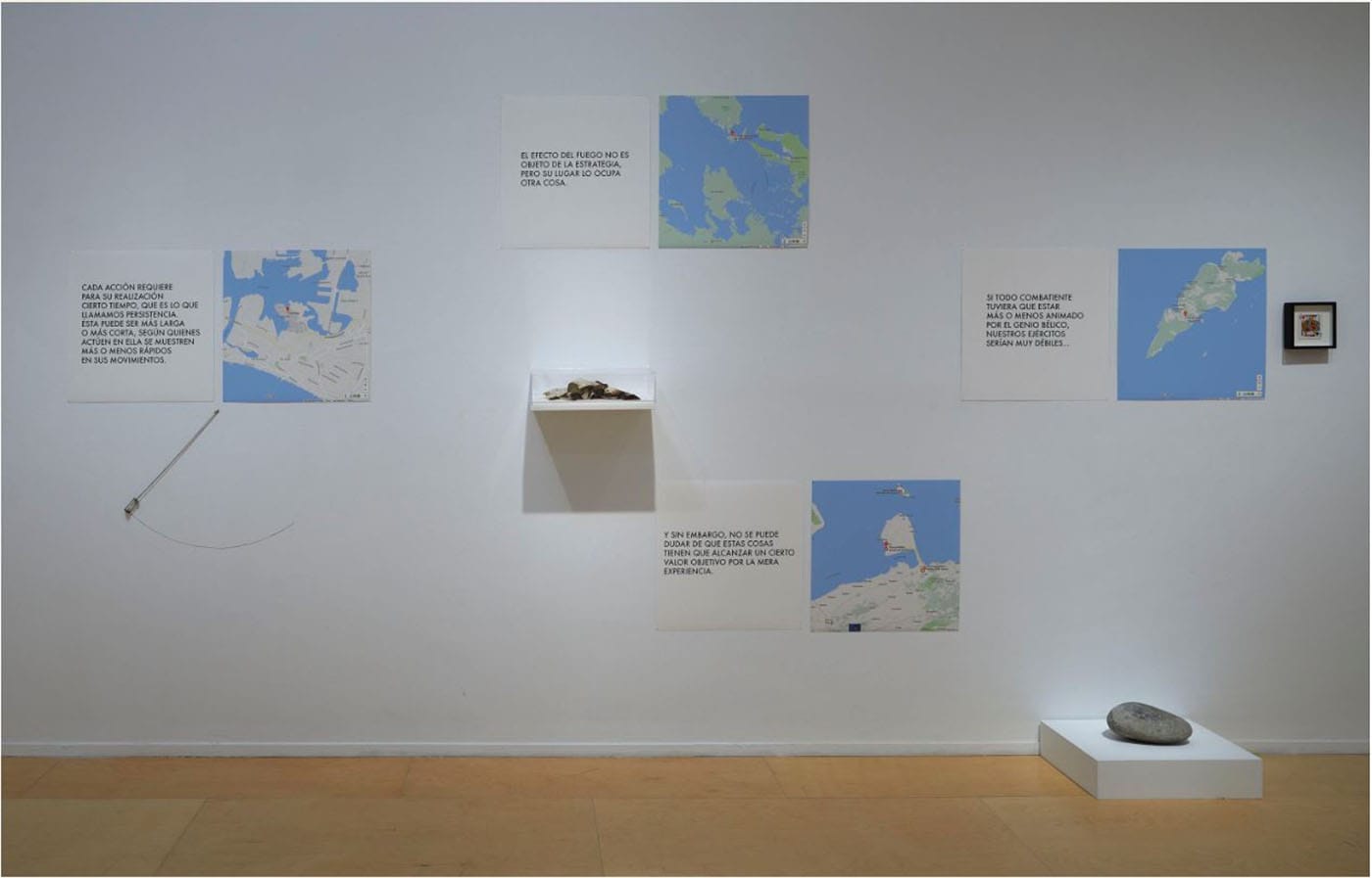 Closing the show, Camnitzer’s newest piece, “About War” (2016–2018), considers the influence of military strategy in contemporary mappings of the world. “About War” juxtaposes quotes from Carl von Clausewitz’s military strategy treaty On War with Google maps locations of US military bases in Latin America. Zaya cites from Camnitzer’s emails: “We are now returning to the most reactionary kind of nationalist fragmentation, […] all of this within the context of a kind of neo-feudalism, where the weapon industry is provoking new military clashes.”
