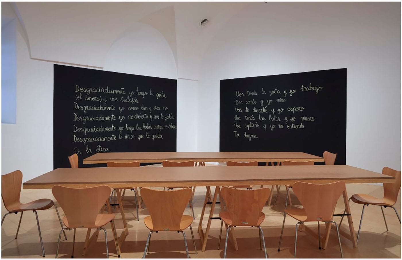 In his series Cuaderno de ejercicios (Assignments Book, 2011/2017), Camnitzer invites the public to follow prompts by drawing on the galleries’ white walls. The instructions read: “Supposedly, matter only exists in three states: as solid, as liquid, and as gas. a) Speculate about the consequences of a liquid sky, b) Explain the destiny of clouds,” and “There are twelve steps between unhappiness and happiness. How would you describe each of those steps?” I first saw this piece in the 2015 Havana Biennial, where school groups had engaged with it as part of their art curriculum. Will this same relationship with the art object happen in a large national museum in Madrid? How far will the Reina Sofía go to make itself vulnerable to the processes of questioning, dialogue, and material interventions on its walls?