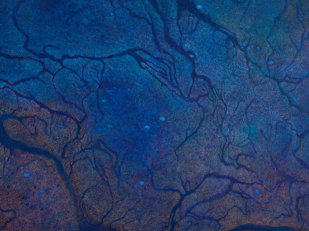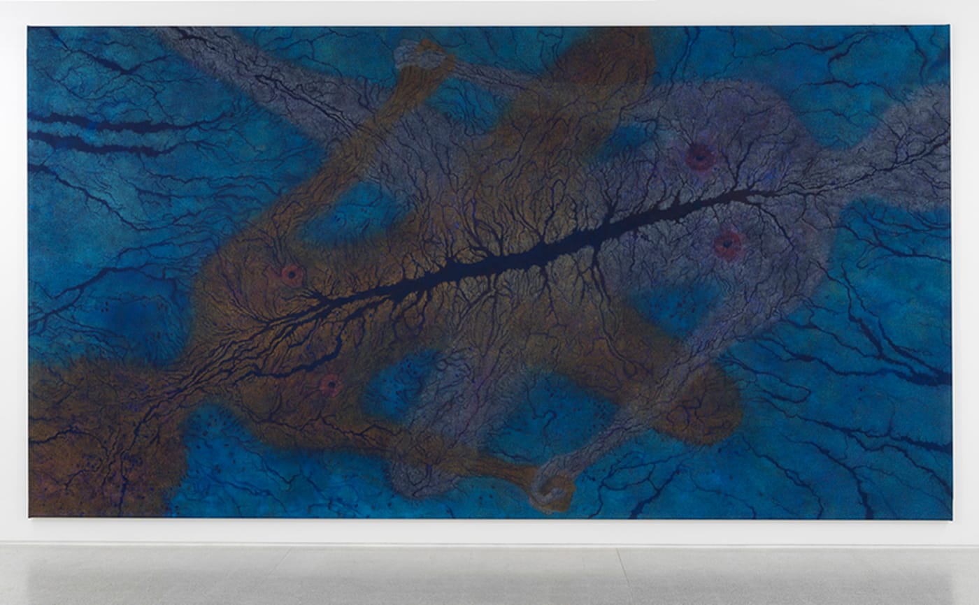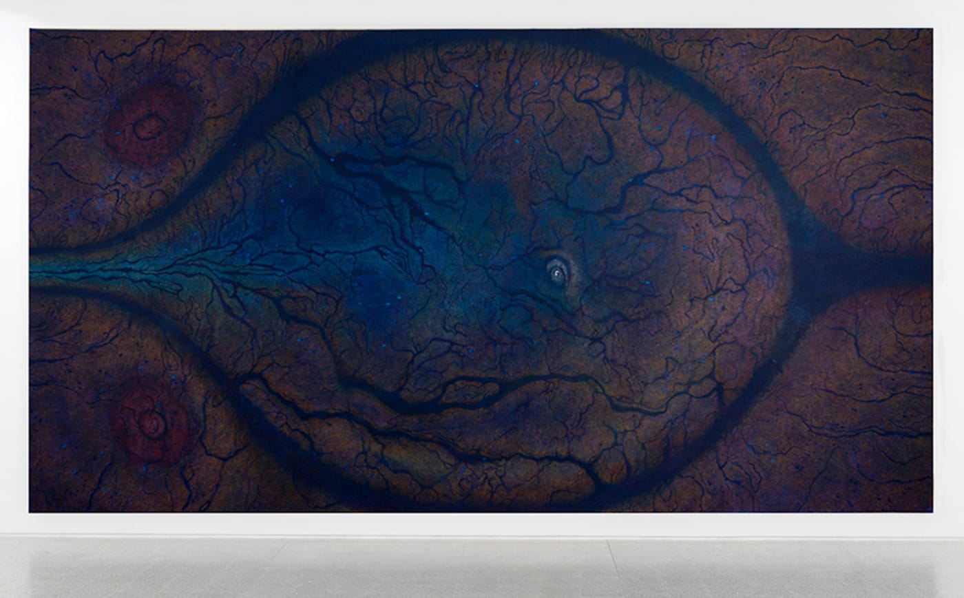 This kind of ambiguity is as much the stuff of these peculiar, haunting images as their inundations of fingerprints and wispy pencil marks. In “Birth,” that one fingerprint to which Rabbia referred is a tiny dot of bright, white paint that, for all its smallness, anchors an entire cosmos. It is nestled in a womb-chamber filled with currents of blue that branch deeply into the enclosed space. That white speck and the immense, veiny network of energy streams surrounding it offer a vision of the immanent — a new life — and the humbling reminder that the fullness, complexity, and unpredictable trajectory of any living thing begin with a mere cluster of cells.
