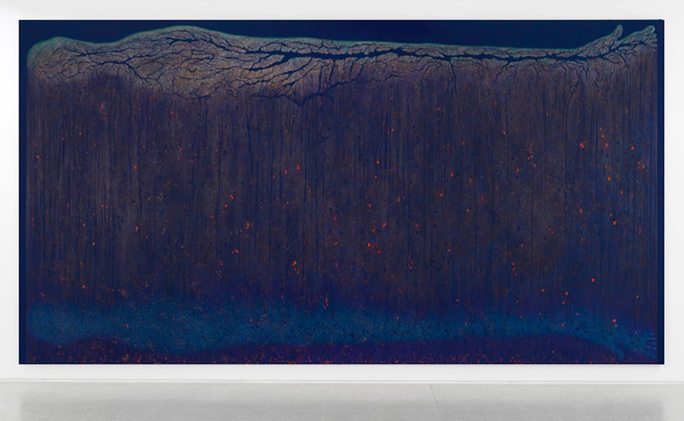 “In making these works, I’ve felt as though I’ve been in a dialog — between myself and the surface,” Rabbia told me during a visit to her Brooklyn studio last year, as she was putting the finishing touches on “Love” before shipping it off to Italy. She was referring to her handling of her materials — gessoing and sanding a canvas before beginning to make any marks on it, including, notably, her own fingerprints. Her “Love-Birth-Death” paintings were all made with acrylic paint, colored pencil, and expansive agglomerations of fingerprints on canvas; each work is nine feet high and more than 16 feet wide, and each one’s pictorial space is saturated with an underlying, luminous-electric deep blue.