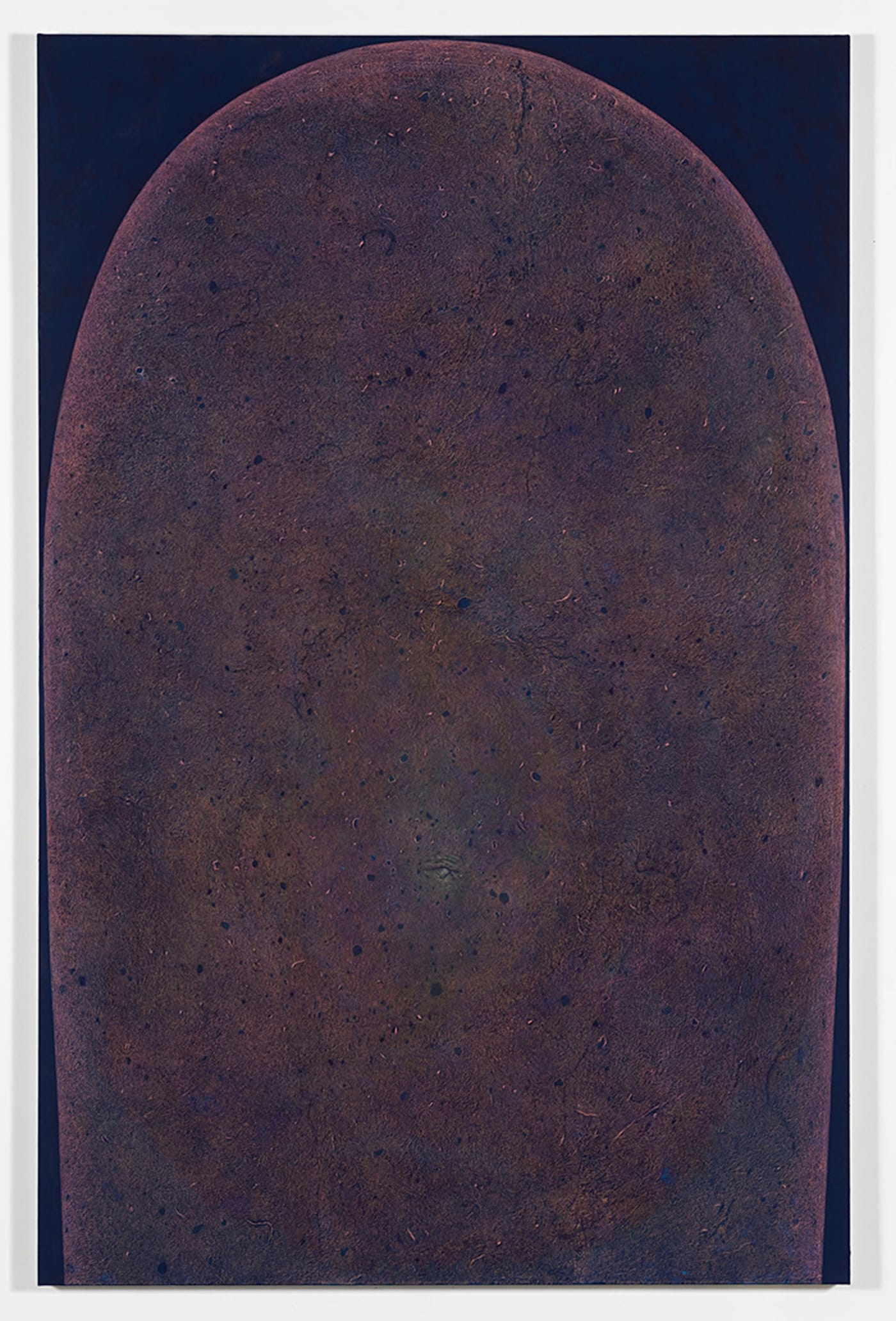 Similarly, three smaller paintings in the Peter Blum show, all of which share the title “Lingam Yoni” (all were made with acrylic and colored pencil on canvas in 2017) are also meticulously crafted. Depicting stelae-like forms, each of which bears a discernible belly button, these images echo the life-cycle theme of their larger mates. Each one alludes to a lingam and to a yoni, which are, respectively, in Hindu art, stylized representations of the omnipotent, masculine deity Shiva and of Shakti, a goddess embodying divine feminine creative power.