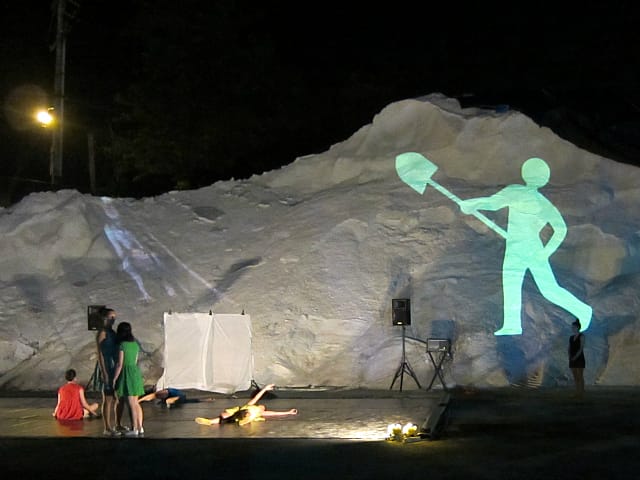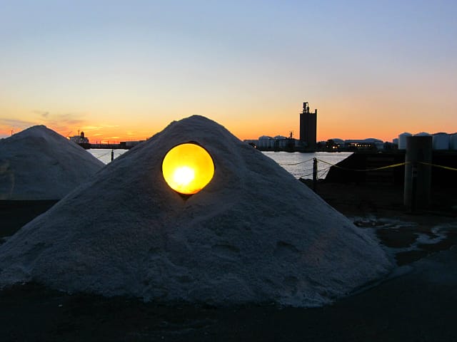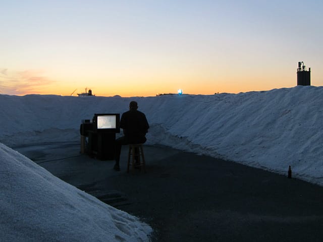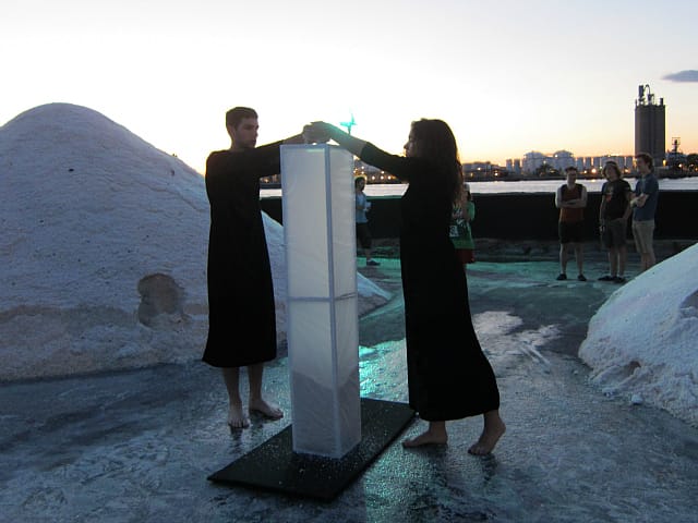 As the sun was setting on Saturday, the hills of salt outside the run-down factory buildings at Lumen 2012 looked otherworldly. The one-night video and performance art festival was staged in the vacant spaces of the old Atlantic Salt Company on Staten Island, where 150,000 tons of salt that had gone unused during the curiously warm winter were transformed into performance pedestals and projection sites. This year’s Lumen was curated by Christopher Eamon with performances in collaboration with Grace Exhibition Space and the Council on the Arts & Humanities for Staten Island. Over 50 artists participated.