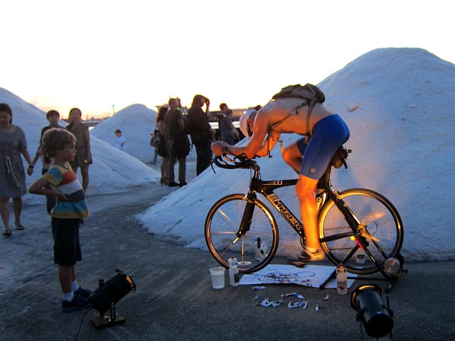 John Bonafede was tirelessly creating a painting collaboration between him on the bicycle and the audience, and while this was less a direct interaction with the salt than some of the other performances, the shadows cast on the white grains behind him became more dramatic as the sun receded.