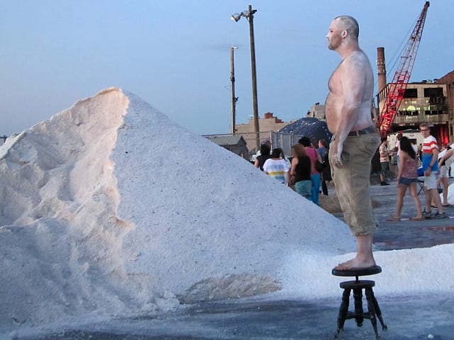 There were a few videos projected on the salt, but more were seen on the walls of the factory (not all videos look good when cone-shaped and highly texturized, I suppose). Highlights included Jay Weichun’s “The Current Carried Our Sediments,” which featured video and interviews from the North Shore waterfront of Staten Island, making it one of the few works with a direct connection to the borough, and Alex Prager’s appropriately surreal “Petit Mort.”