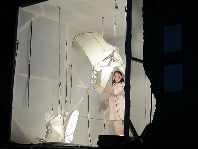 When my mind was starting to get worn out by the continuous loops of videos, I excitedly joined the crowd around DP Lampman’s “Brain Furniture,” where the artist gave a charming and strange performance in an illuminated box containing three lit, disembodied arms. While accompanied by eerie, music box–like tracks, she acted as a puppeteer and animated the disjointed forms.