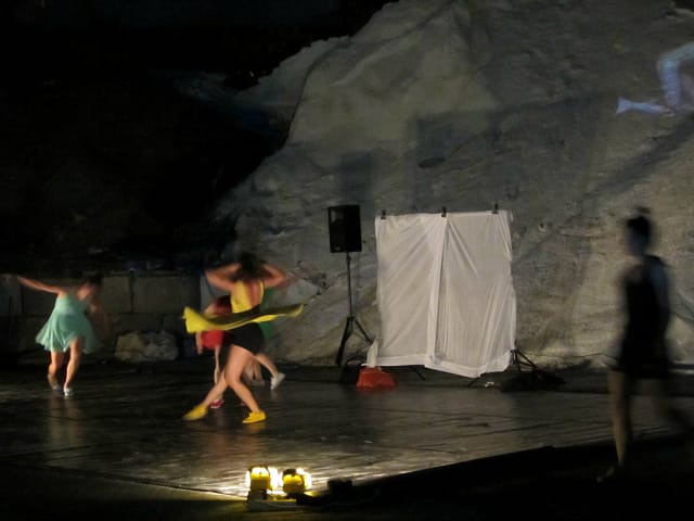 Dancers choreographed by Melissa West, with music by Tom Bones, in “sunsets, recess, gyres” seemed to tirelessly move for the whole evening in front of the endless shoveling of Jeanne Verdoux’s “Man at Work.” Since much of the performance at Lumen was separate from the videos, this pair represented a nice, continued interaction throughout the evening in front of the most towering mound of salt.