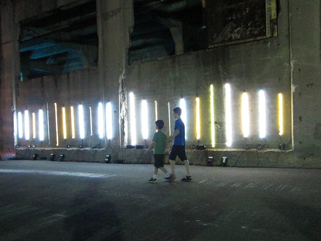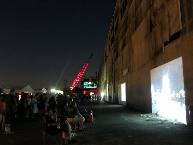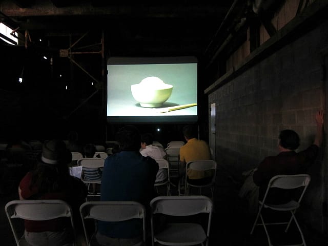 Lumen encouraged a sense of exploration around the space, but there was still a main stage screening room inside one of the factory buildings, which had an hour-long loop of videos by around a dozen artists. As a straightforward video presentation, it was more passive and traditional than the rest of the festival. I did catch a few videos and especially enjoyed Chee Wang Ng’s mesmerizing “108 Global Rice Bowls,” which showed photographs of bowls of rice from around the world, each presented with a clang. The total number, 108, adds up to the number of beads in a Buddhist rosary.