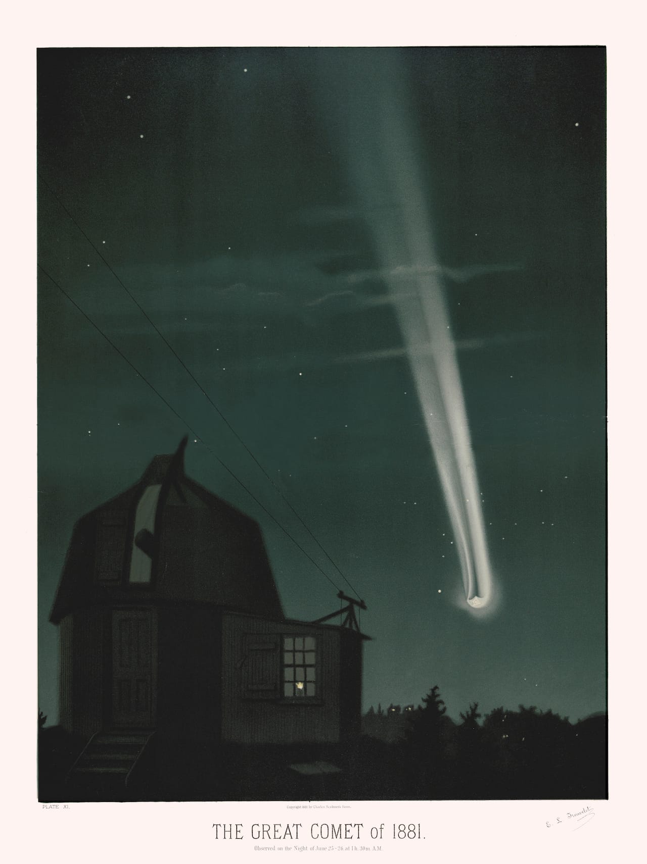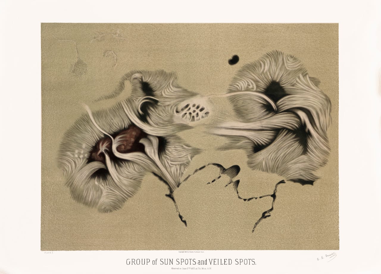 One major change over the years is a lessening of the emphasis on the divine now that the workings of astronomy are more evident. A 1573 illustration by Portuguese artist Francisco de Holanda feels strikingly contemporary with its fusion of abstract shapes and the Holy Trinity, shown as a human figure shooting lightning from his hands; the explosion of illumination and the words “Let There Be Light” in Latin evoke the dawn of our universe. Earlier works, like Persian astronomer Abd al-Rahman al-Sufi’s Book of Fixed Stars from 964, give the first glimpses of galaxies neighboring our Milky Way, including Andromeda and the Large Magellanic Cloud. Étienne Trouvelot’s late-19th-century pastels based on his view from the Harvard College Observatory vividly illustrated phenomena like sunspots; his depictions went unrivaled for a century after.