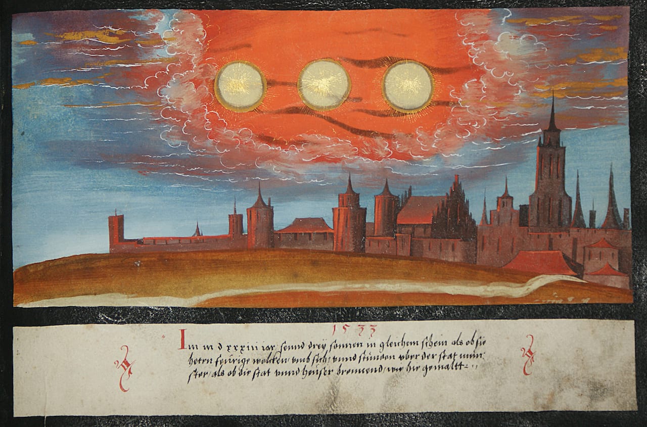 Of course, there are also the errors that we now know to be woefully wrong, like three suns supposedly shining over the world in 1533 (most likely a sun dog illusion), or mountain peaks on the moon in an 1874 illustration. Our knowledge of space is still incomplete, however, our visualizations still as much a science-based fiction (see NASA’s exoplanet illustrations). As Benson’s book argues, we have long been grasping at our place in the galaxy through these artistic depictions, and there’s something so compelling in this quest that it continues to join science, belief, and a compulsion to understand.