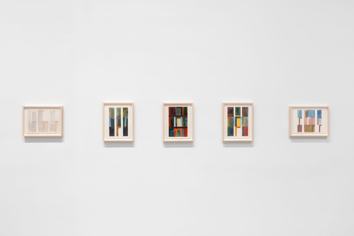 In a notebook dating from September 1981 through November 1983, where he wrote “Windows and Walls” on the inside cover, Novros investigated geometric structures based on the rectangular grid of window panes framed by bands and, separately, extended horizontal rectangles divided into different, abutted sections of color. In these works, structure, color, and light are inseparable.